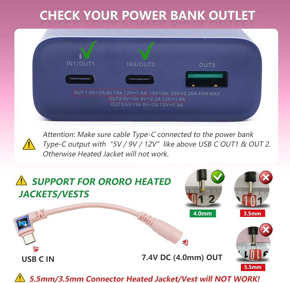 Why your Jacket cannot work with this Cable? At first, make sure you have a battery bank with PD type C fast charging port. And then connected this heated jacket adapter cable type C male port to the PD battery bank, while the cable DC port connects with 7.4V or 8.4V heated jackets(make sure your jackets has 4.0mm DC jack), then it will works perfectly!