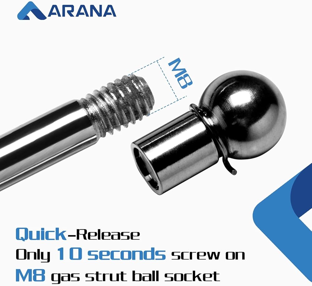 Installation Guide: ARANA M8 Ball Sockets easy to remove design to replace your worn out 10mm end fittings, just screw them off from the gas strut lift supports and remove off from the ball stud on the vehicle with a screwdriver