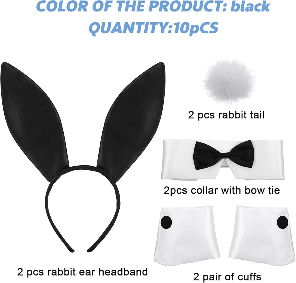 Package Contents: you will receive 2 cute rabbit ear role-playing headbands, 2 pcs of tie collars, 2 pairs of cuffs, 2 rabbit tails, and 2 pairs of mesh socks to meet your and your companions' matching needs