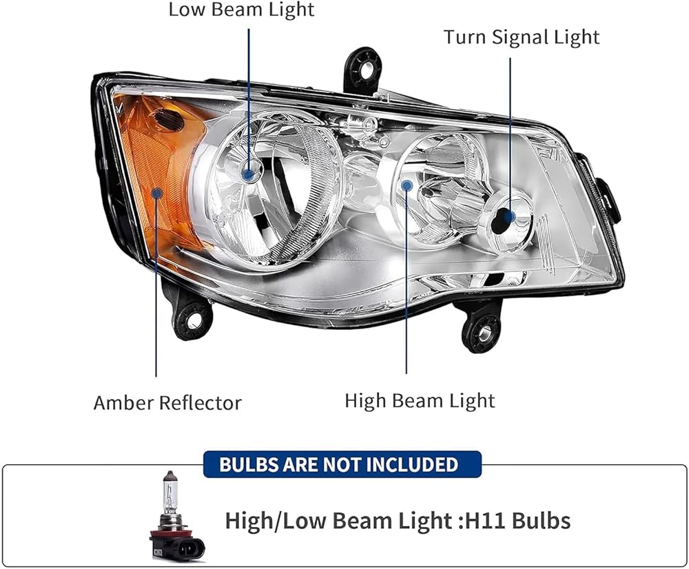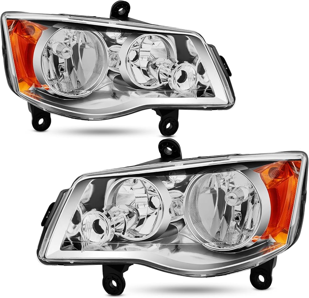 Headlight Assembly Compatible with 2011-2020 Dodge Grand Caravan / 2008-2016 Chrysler Town & Country Headlamp Chrome with Amber Reflector Factory Style Replacement Pair