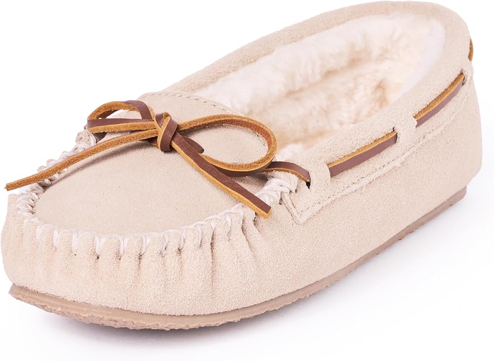 - Faux fur-lined slipper featuring moccasin toe and leather tie with around-the-collar lacing