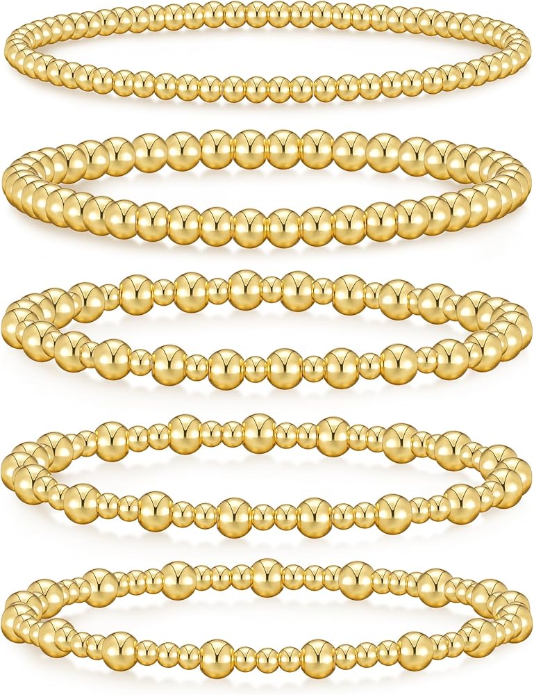 Stretch Stackable Bracelets for Women:Crafted with a durable and flexible elastic band, this women gold bracelet features two sizes of gold beads (3mm+5mm) for a unique look. Dainty gold bracelet set for women include 5pcs, can be worn alone or stacked according to your outfit or other jewelry. Length about 6.5 inches , fits most wrist sizes.
