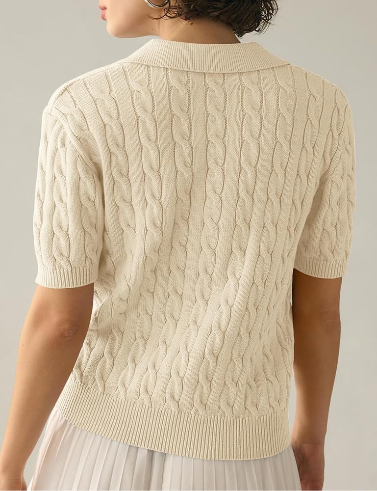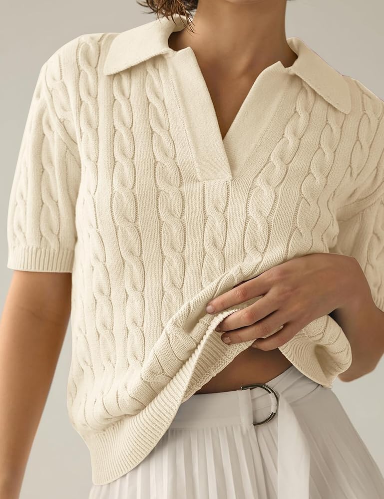 Womens Short Sleeve V Neck Sweaters Cable Knit Collared Pullover Sweater 2024 Trendy Comfy Polo Shirts