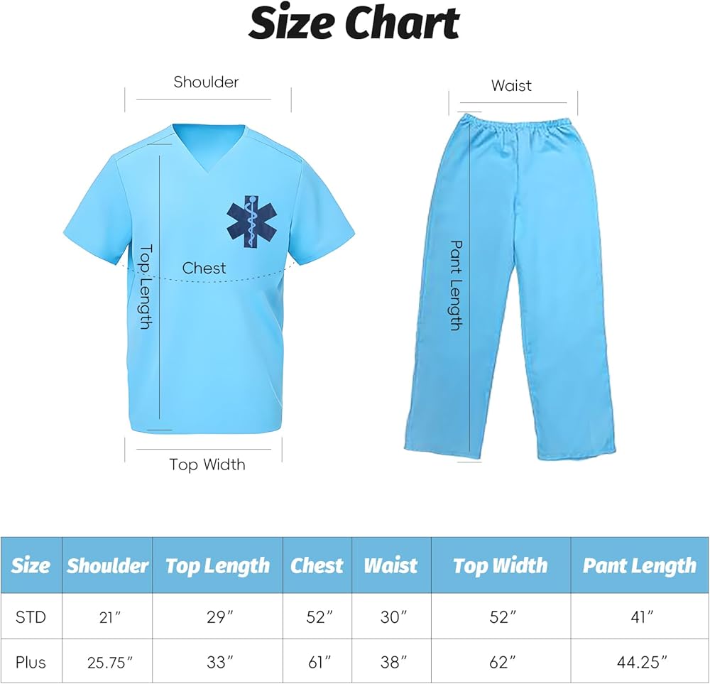 Design: The scrub top features a print on the chest, matching with mask and cap, great for role play.
