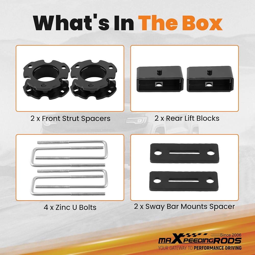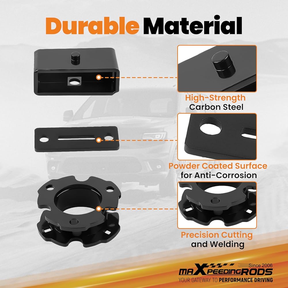 Improved Performance: The Leveling lift kit improves overall performance in off-road and on-road driving conditions by reducing front-end sag, eliminating factory rake and achieving a level stance