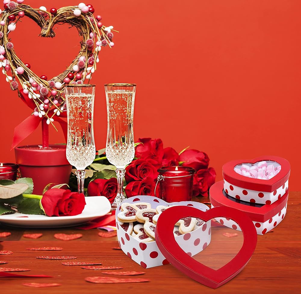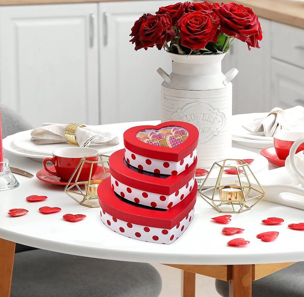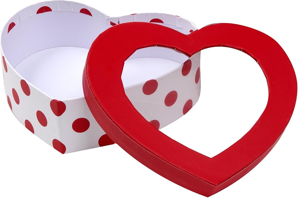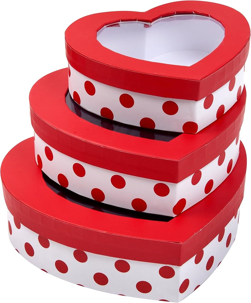 Send your special someone sweet treats packaged in a valentine's day heart-shaped treat box. Valentine Heart Boxes FIlled cupcakes, candies or cookies with make an awesome gift for family, friends and work colleagues. Each box features a White and Red Polka Dot Design with Red Cover and Clear Window. Set of 3 Boxes; Size: Large:8.4” X 7.3”X 2.5”,Medium: 7.6” X 6.5” X 2.2”, Small: 6” X5.5” X 2.0”. Set of 3.