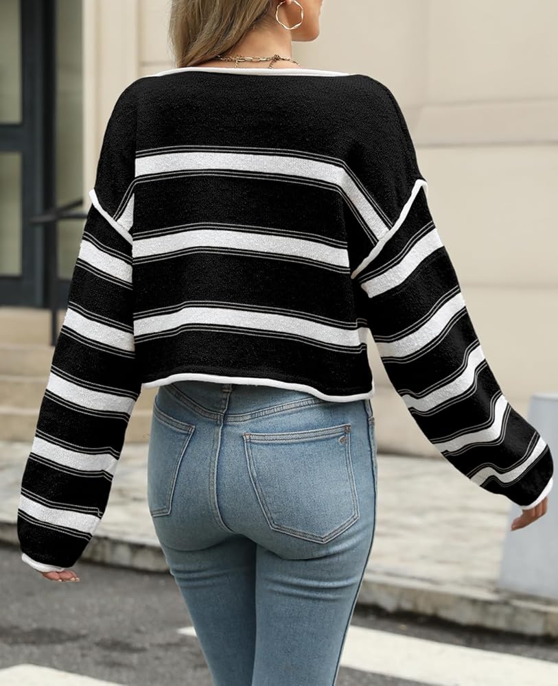 Features: long sleeve crop sweater with a wide crew neckline, can eaily change it to off one shoulder wearing style, cropped sweater design, loose-fitting silhouette , fashion striped pattern, all making this women sweaters looks trendy, add extra flair to your everyday.