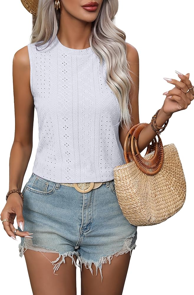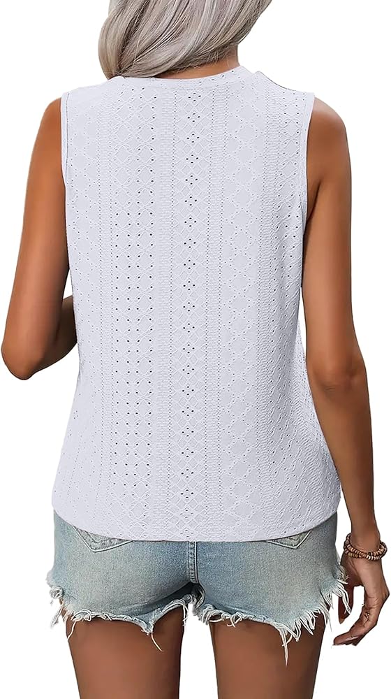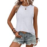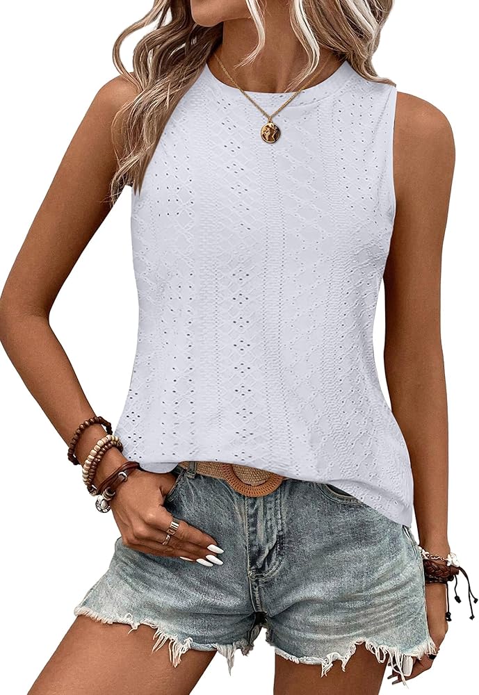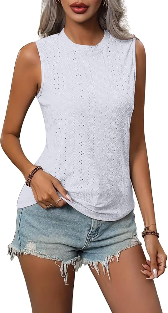 Feature: Sleeveless tops for women 2024. Unique pointell eyelet design, crew neck, loose fit, solid color. The intricate eyelet holes create a subtle see-through effect, adding a hint of allure and femininity to these sleeveless shirts.