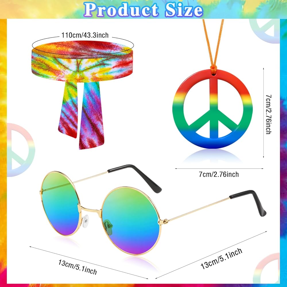🎸【Hippie Cothes Accessories】The printed headband replaces the traditional hippie headscarf with an adjustable design that won't mess up your hair easily. The 70s sunglasses and peace sign necklace are made of PC material, sturdy and not easy deform, lightweight and comfortable to wear, and the appearance is designed with reference to the 70s hippie style, which is very retro and trendy. The size is suitable for most men, women and children.