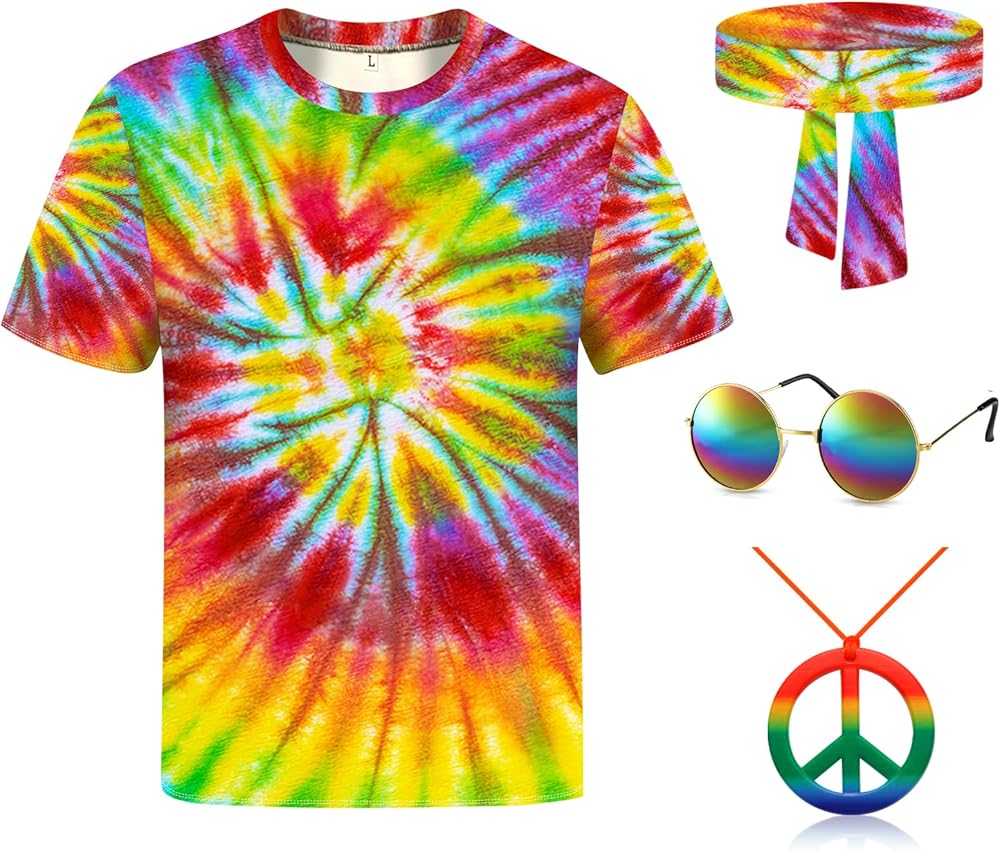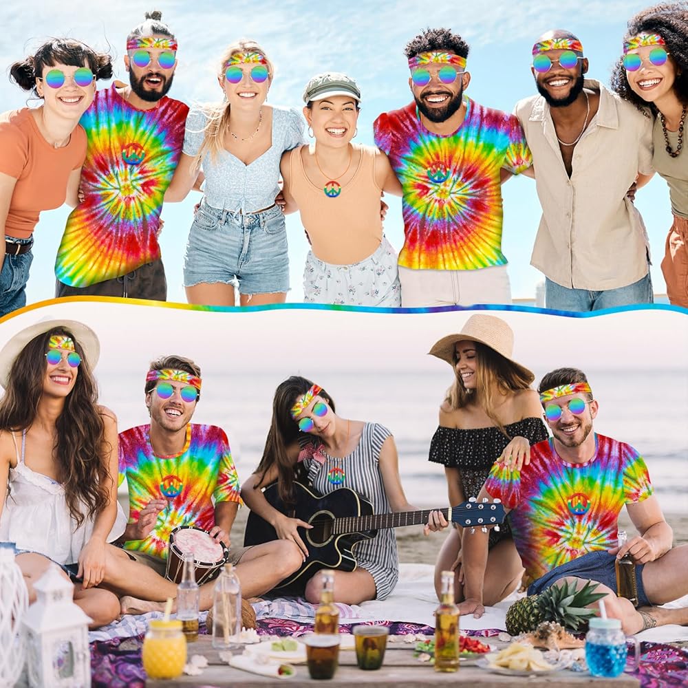 🎸【Fun 4PCS Hippie Costume Set】The hippie costume accessories set includes 1 piece 70s outfits for men, 1 pair of rainbow sunglasses, 1 piece hippie headband, 1 piece peace sign necklace. The stylish womens mens hippie costume is the perfect accessory to dress up a 60's 70's look. They will bring you new surprises and experiences!