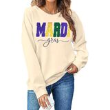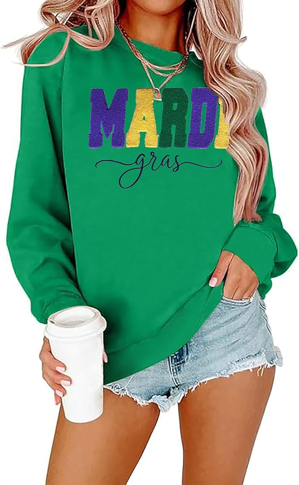 Women Mardi Gras Sweatshirt New Orleans Carnival Outfit Chenille Patch Pullover Fat Tuesday Gift Long Sleeve Sweatshirt