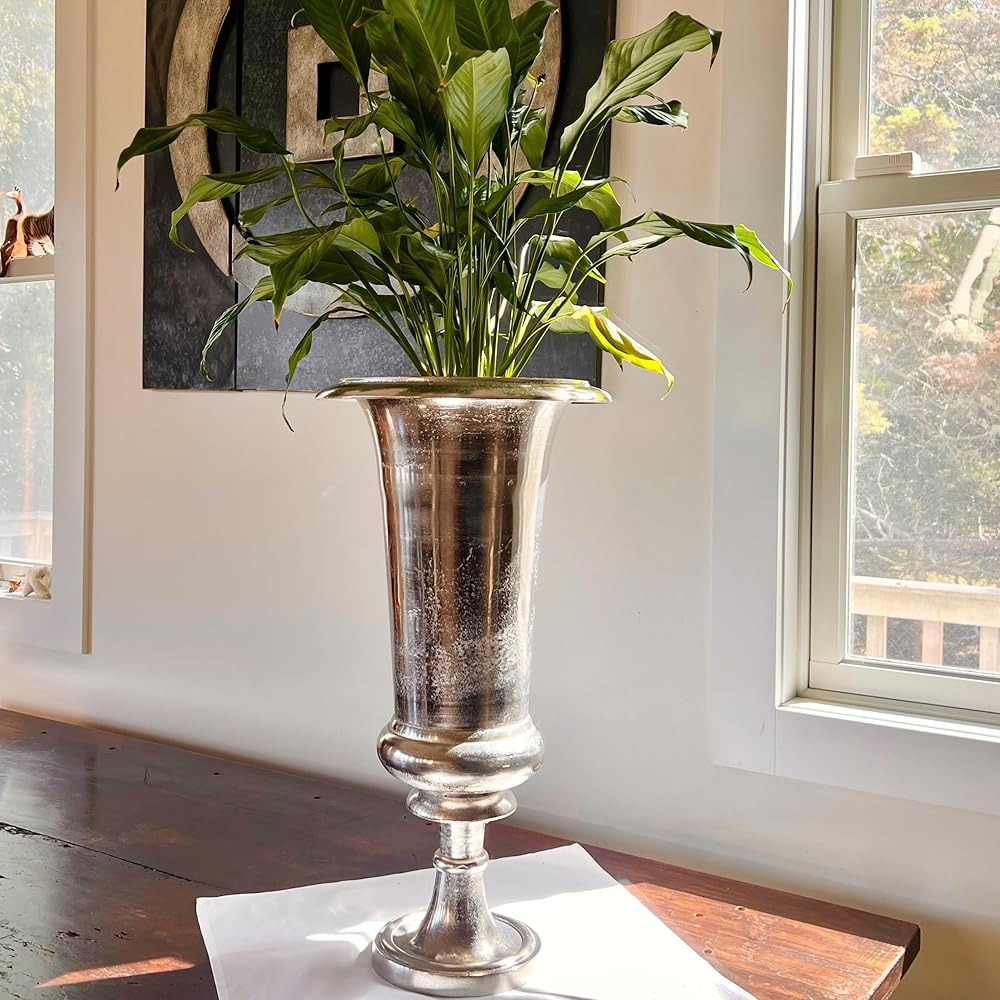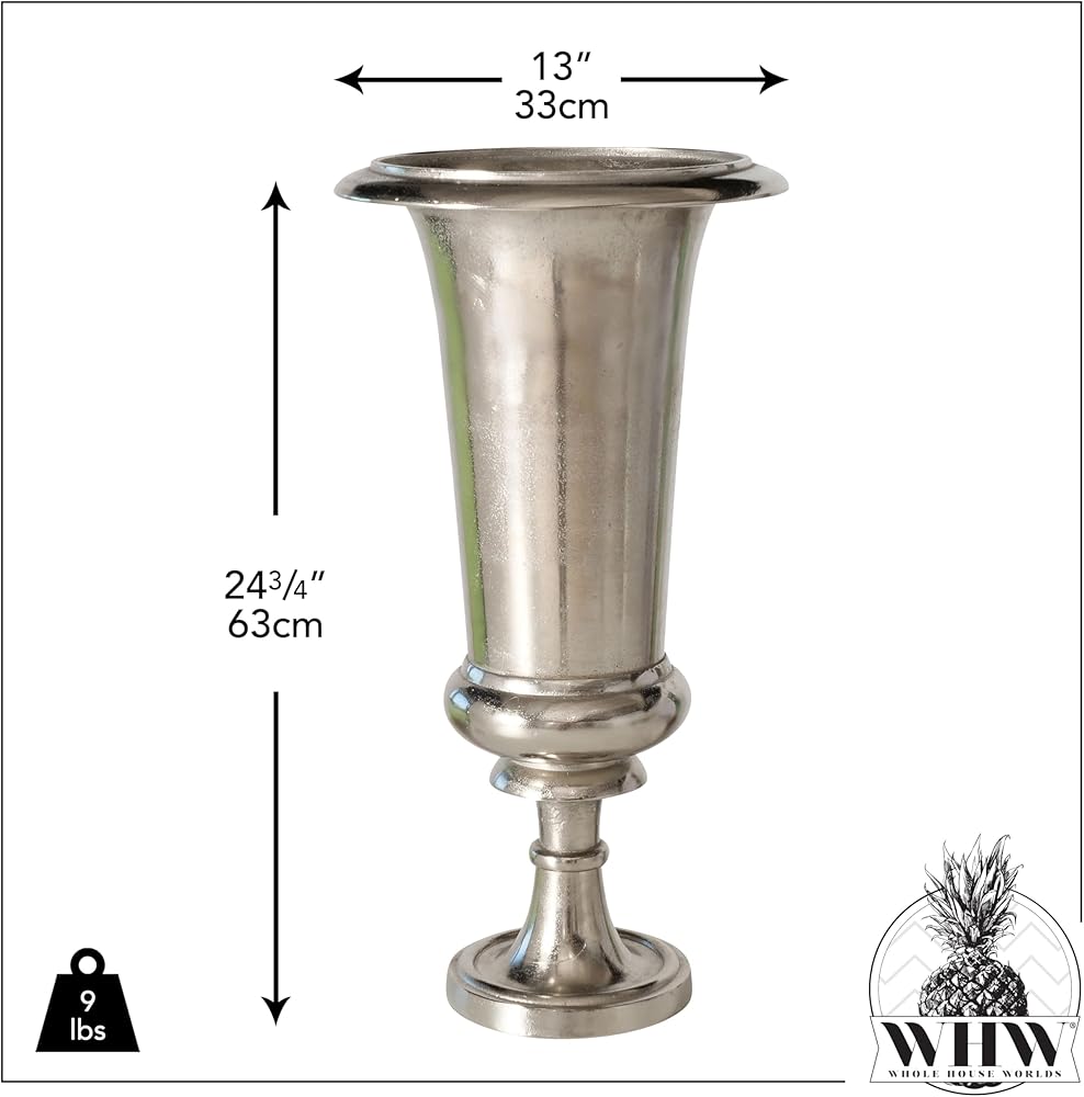 Turn on contemporary flair and style plants and floral arrangements with this hard working thick walled metal trophy vase. A modern interpretation of classic urn this piece has an ample belly atop a sturdy pedestal base.