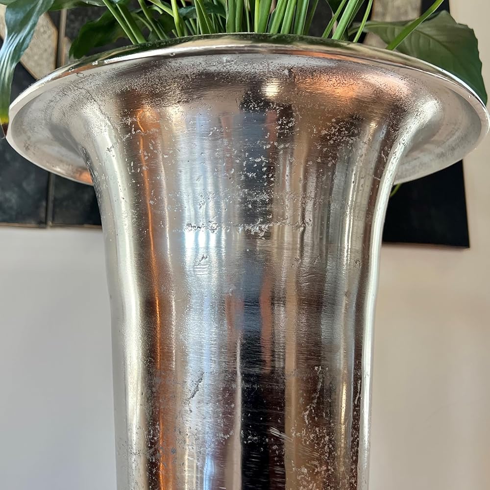 Hand cast of durable silver aluminum, the exquisite craft finish is polished to a gleaming shine. Each vase is unique since they are made by hand with smooth-sanded textural nuances like crinkles and pits .