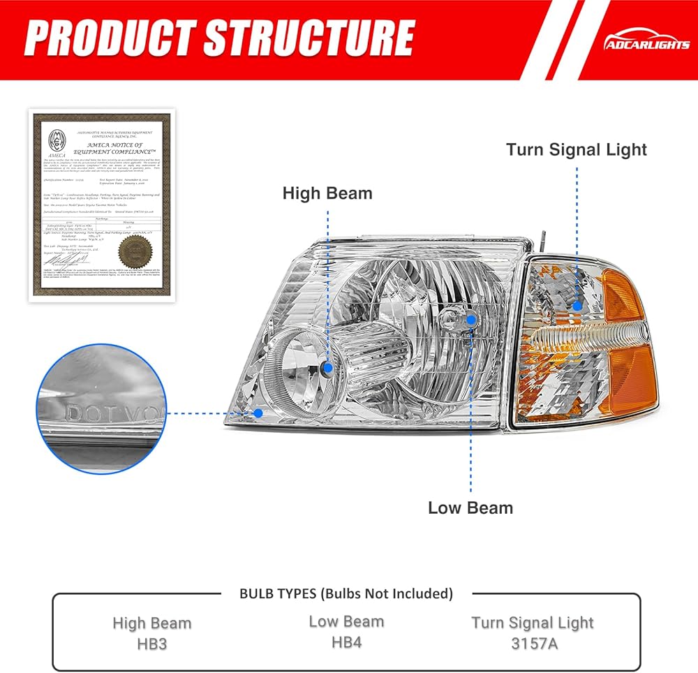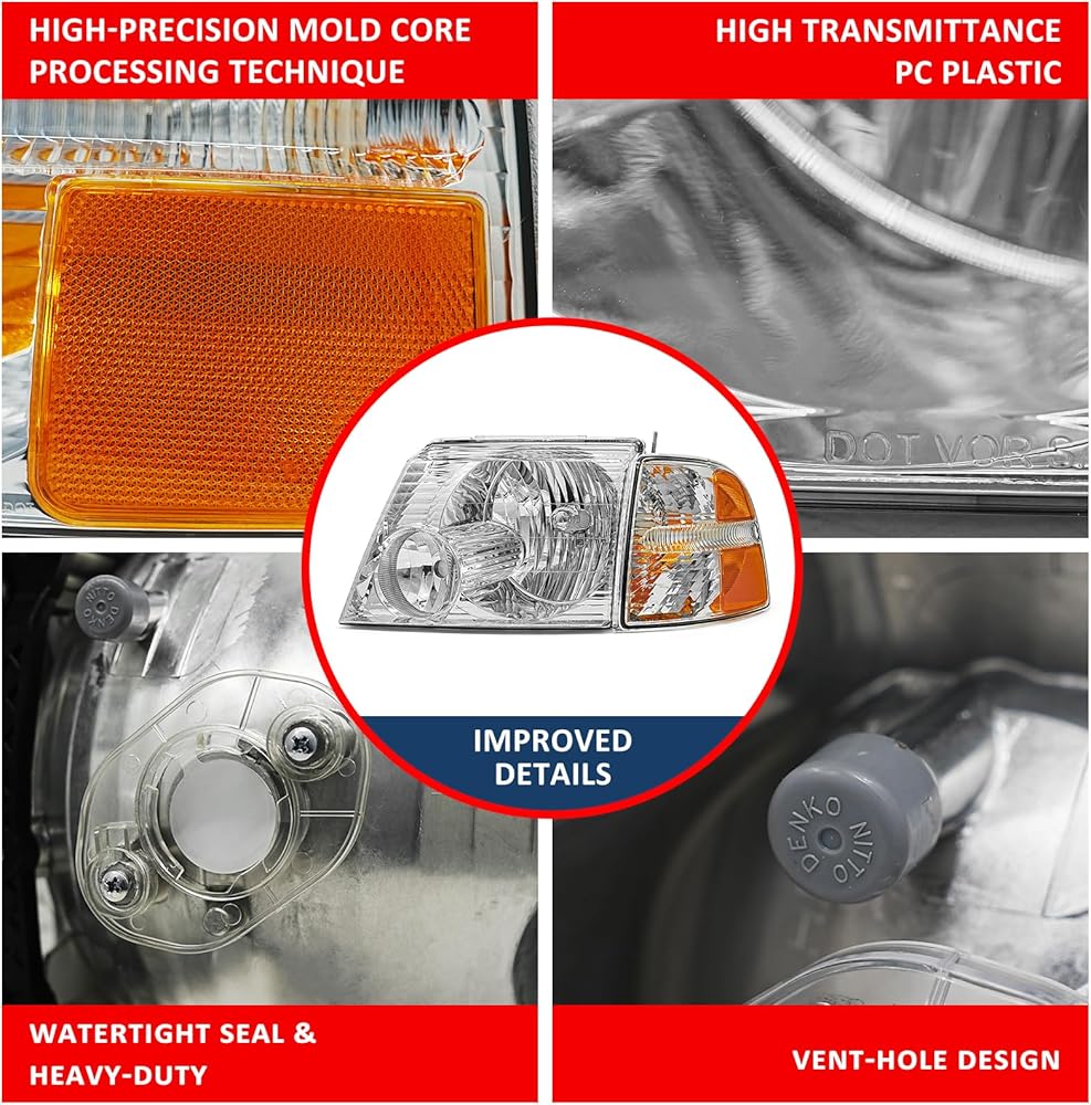 Headlight Compatible with 2002 2003 2004 2005 Ford Explorer (Does NOT Fit Sport & Sport Trac Models) Chrome Housing Amber Reflector Replacement Pair