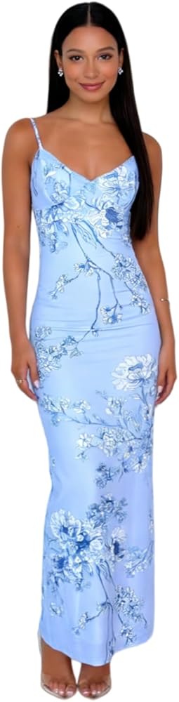 ZGMYC Women's Elegant Spaghetti Strap Floral Maxi Dress Sexy Sleevelss V Neck Bodycon Lounge Dress Beach Party Dress Evening Gown