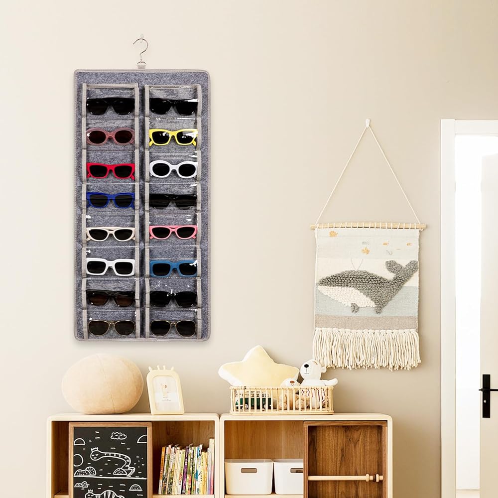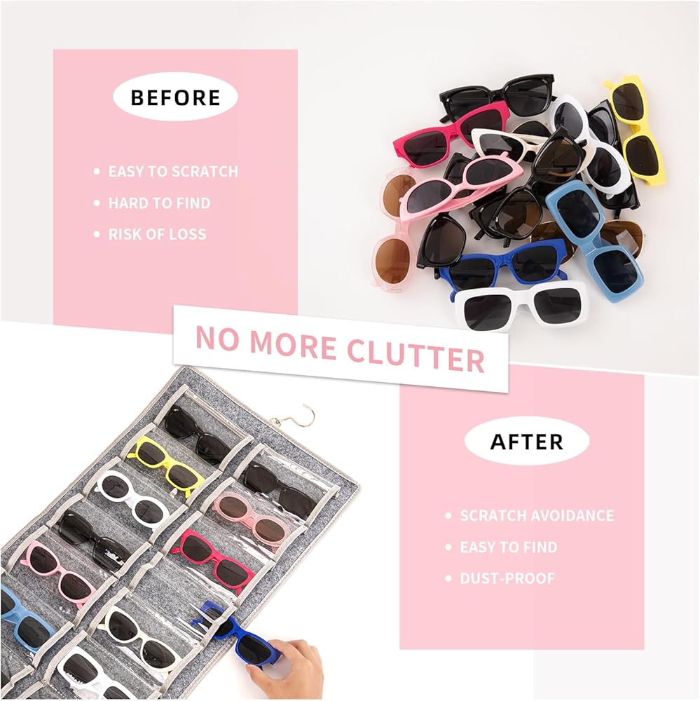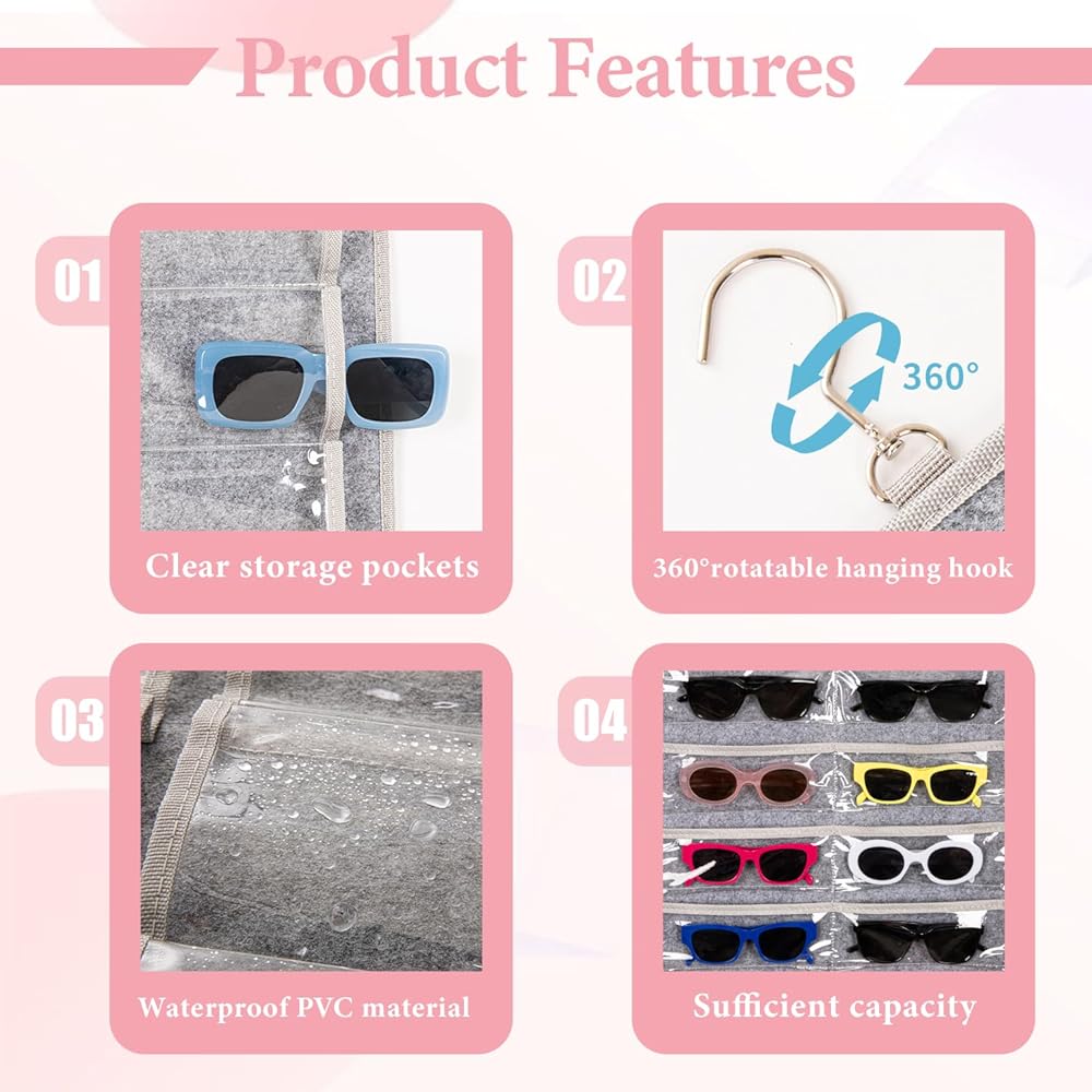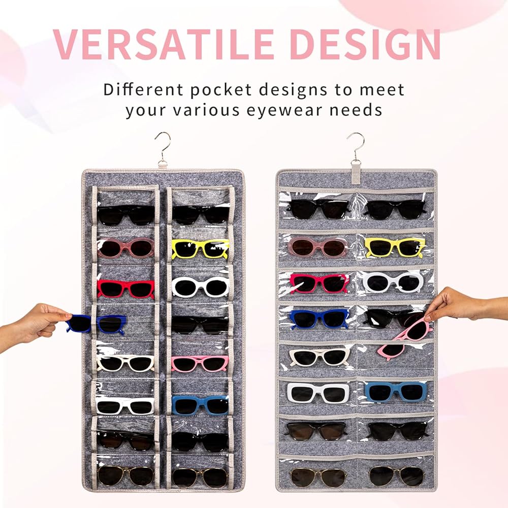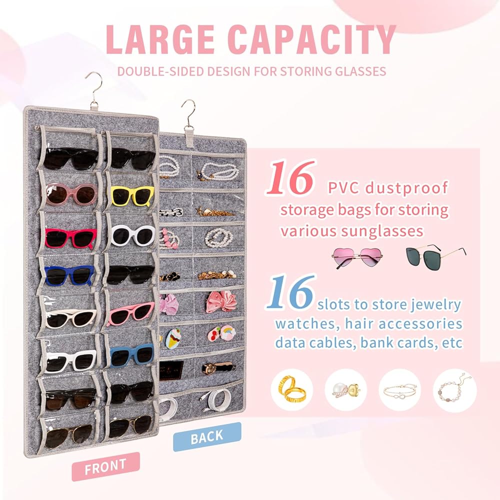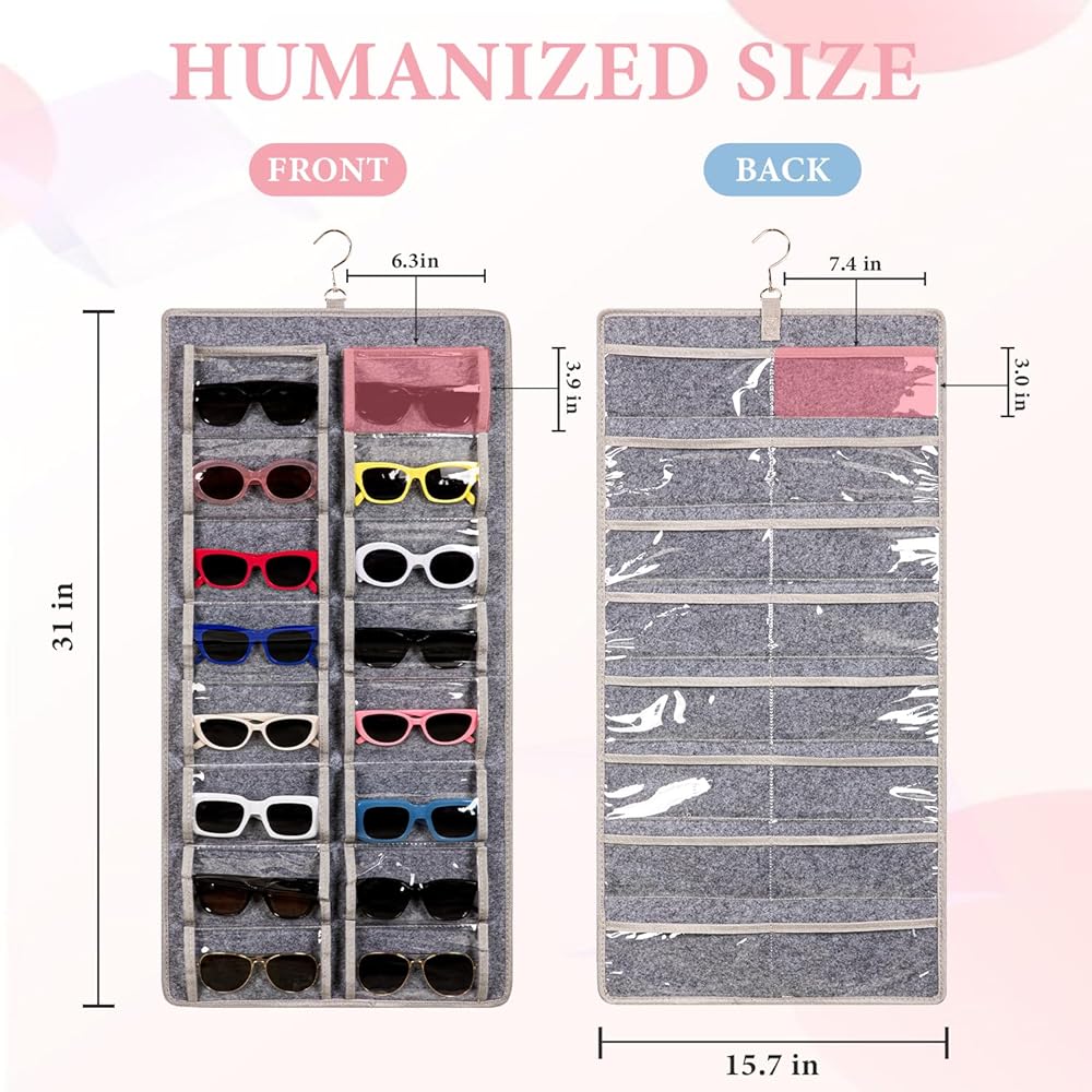 Double sided Sunglasses Storage organizer: Made of felt material, and with 32 transparent PVC slots, dustproof and easy to clean. 360°rotatable hanging metal hook makes it easier for you.