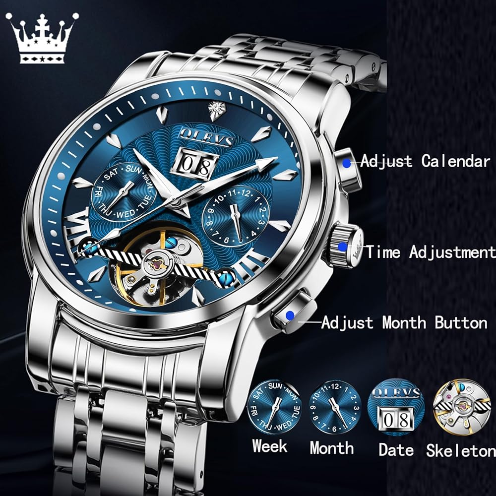 OLEVS Watch Men Automatic Self Winding Watches for Men Stainless Steel Mechanical Diver Large Dial Skeleton Classic Waterproof Diamond Date Men's Wrist Watches Relojes para Hombres