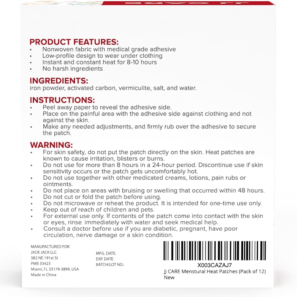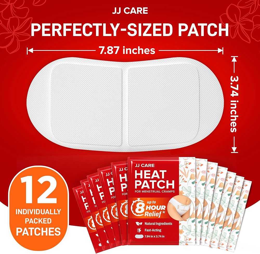 JJ CARE Heat Patch for Menstrual Cramp Relief (12 pcs Large), Menstrual Period Cramps Relief with Air-Activated Carbon, Menstrual Heating Patches for Period Cramps - 3.74 x 7.87 inches