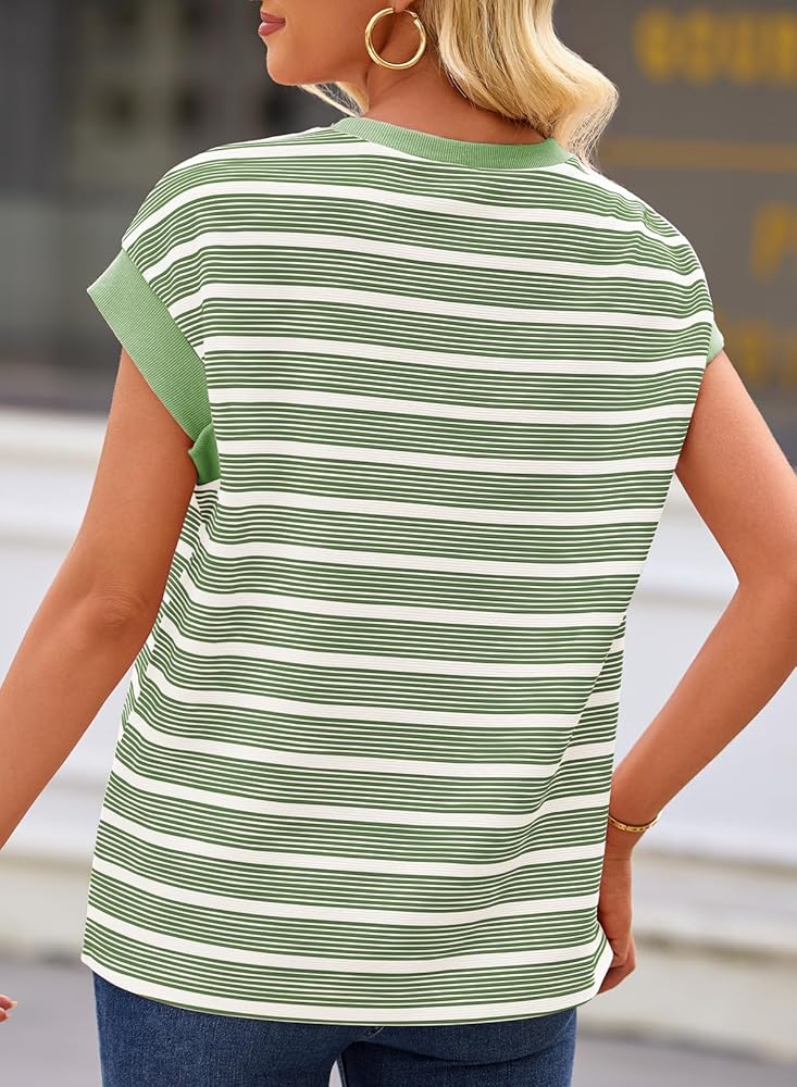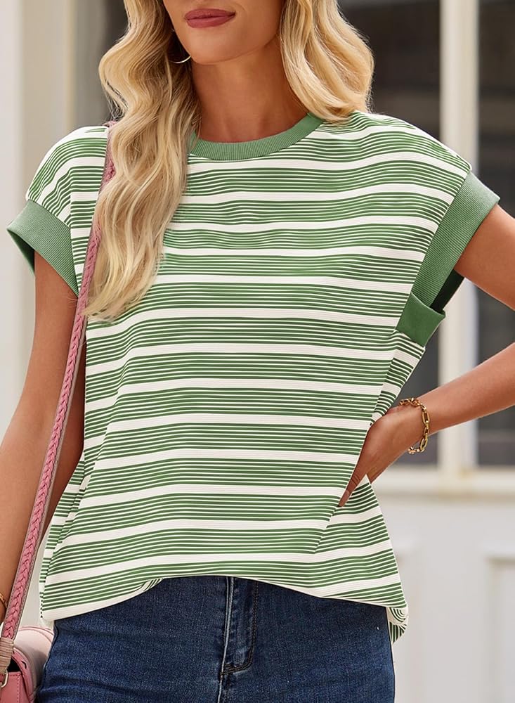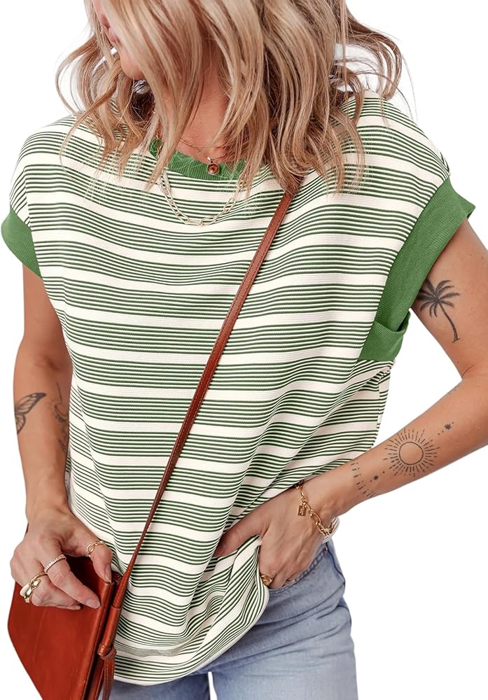 FEATURES: 2025 spring summer women's tops, round neck/crewneck striped short sleeve t-shirt, loose fit, unique cap-sleeve design, classic stripe design combined with knit fabric textured, showing high level of texture