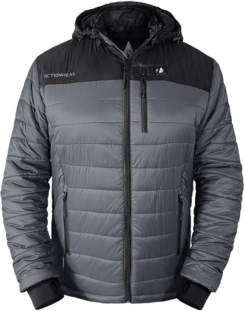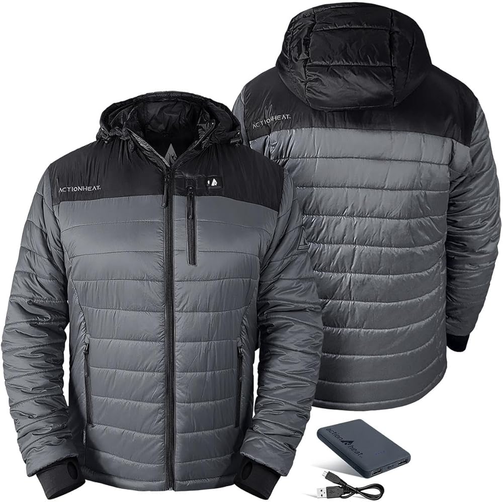 ActionHeat 5V Men's Puffer Jacket is the new and innovative way to enjoy your winter sports without being affected by cold temperatures. This heated jacket offers extreme warmth and cozy comfort thanks to the tri-zone heating technology. It features durable and flexible construction, which offers unrestricted movement during skiing, climbing, running, and other similar activities. Providing superb installation is a 6000 mAh power bank, which is safely put in a concealed pocket and provides up to 150°F warmth for 4.5+ hours when used on the lowest setting. Controlling the temperature is fairly easy with touch controls, allowing you to select the optimal temperature for your activities. Even though it is an electronic component, this jacket is machine washable on a gentle cycle. It is available in a combination of black and olive green color.
