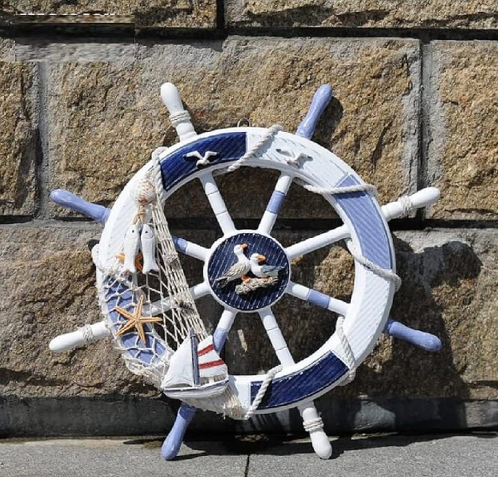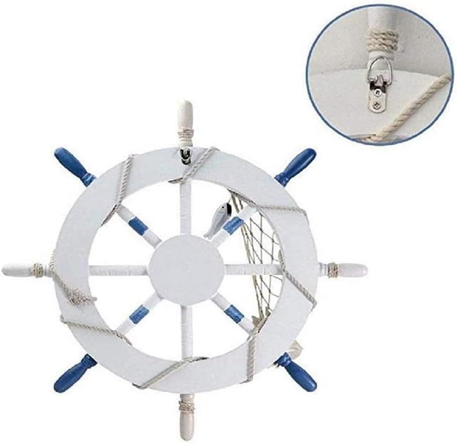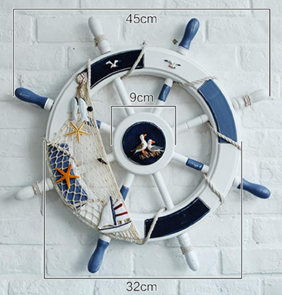 Ship Steering Wheel Material: Wood Size: 45cm / 18 inch Ship Steering Wheel. Hand painted wood ships wheel is the perfect addition to any nautical themed Collection, A nice addition to the ocean themed room. Its great for the boys' room and their nautical theme. Mediterranean vibes decoration perfect gift for seafaring family members. This wooden ship steering wheel with a fishing net, some shells and rope on it make it the perfect nautical wall hanging decoration to your home.It is ideal for those who love sailing and nautical wall art. This boat steering wheel decor can be hung in the living room/kitchen/bedroom/bathroom/office/coffee shop etc.Creating a Mediterranean vibes to your guests and friends.
