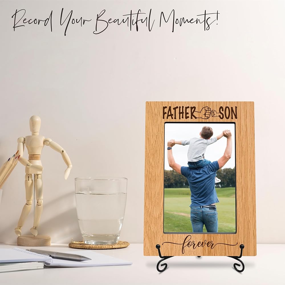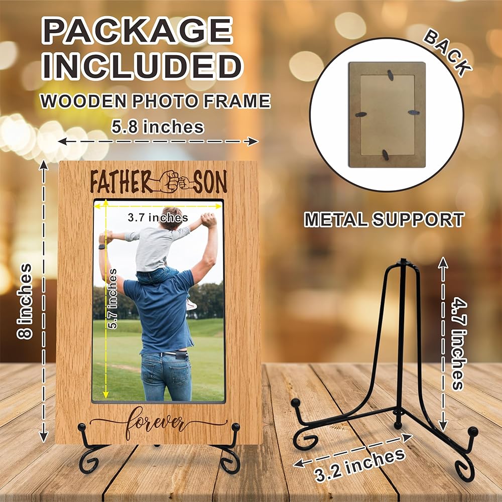 classic wood frame with black metal stand - father & son forever - wooden frame for 4"x 6" vertical picture, gift for dad, rustic photo frame, father's day gift and decorations (A02)