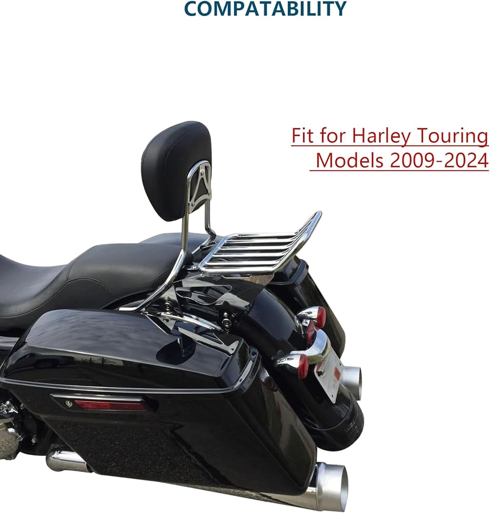 🏍 FITMENT-Our motorcycle luggage rack is compatible for Harley Davidson Touring 2009-2024 models(But not for 2009-2024 models equipped with premium detachable backrest with adjustable recline). FLHTC, FLHTCU, FLHTK and FLTRU models equipped with rigid mount tour pack require purchase of detachable tour pack conversion kit;FLHX, FLHXS, FLTR and FLTRX models require separate purchase of antenna relocation kit or hidden antenna kit.