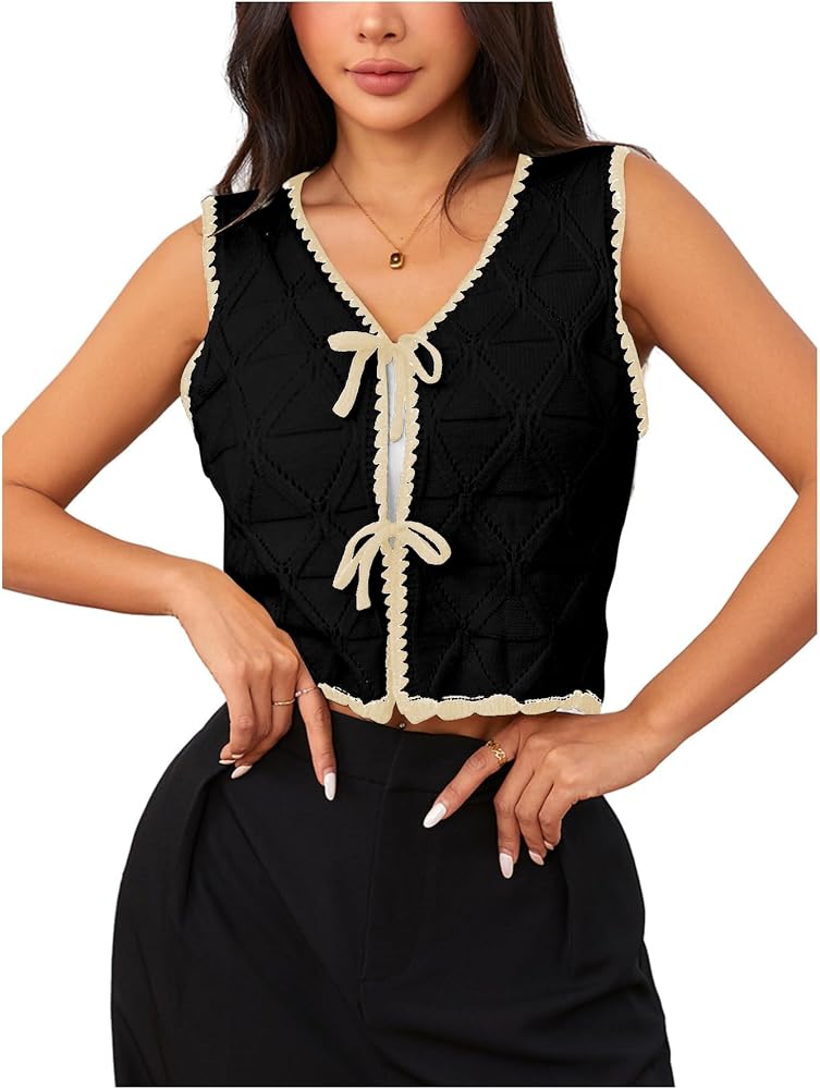 MAKEMECHIC Women's Summer Sweater Vest Tie Front Old Money Clothes V Neck Contrast Crop Knit Tops