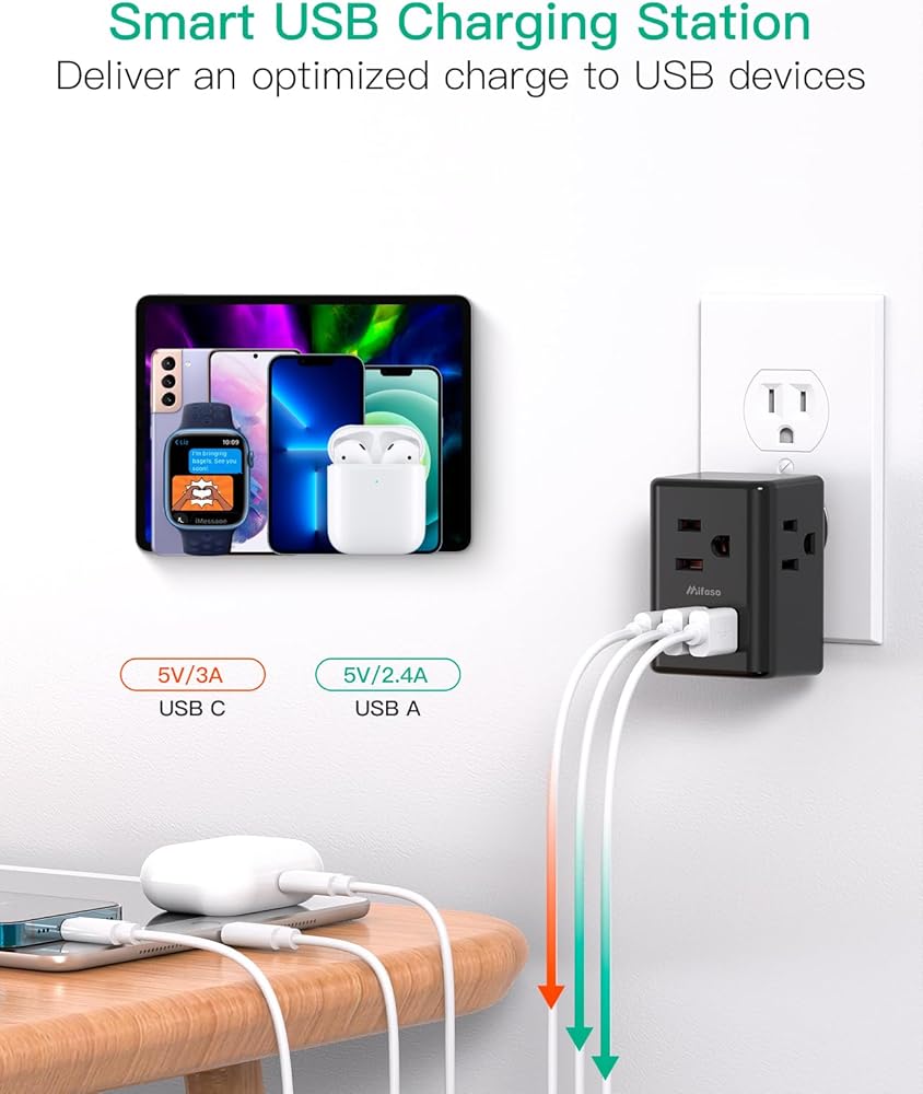 【Compact Travel Size】- This outlet splitter is mini size: 3.0*2.4*1.6 in, compact and lightweight for easy travel and packing.