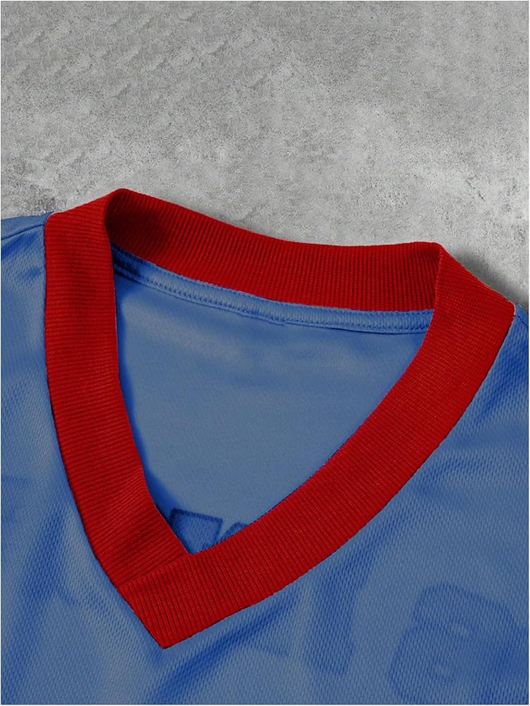 • Features: Color block, short sleeve, v neck, number print, letter print, loose fit, plus size tee shirt for men