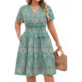 IN'VOLAND Women's Plus Size V Neck Knee Length Dress Casual Floral Dresses Summer Short Sleeve Sundress with Pockets