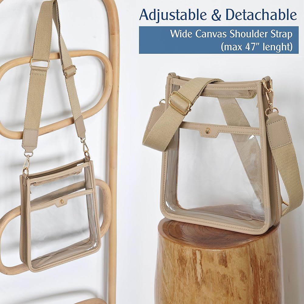The Modern Clear Purse come with detachable and adjustable long strap(47''lenght),Made of canvas and wide design for comfortable shoulder ,it can be worn multiple ways as a crossbody or toss in your tote as makeup bag.
