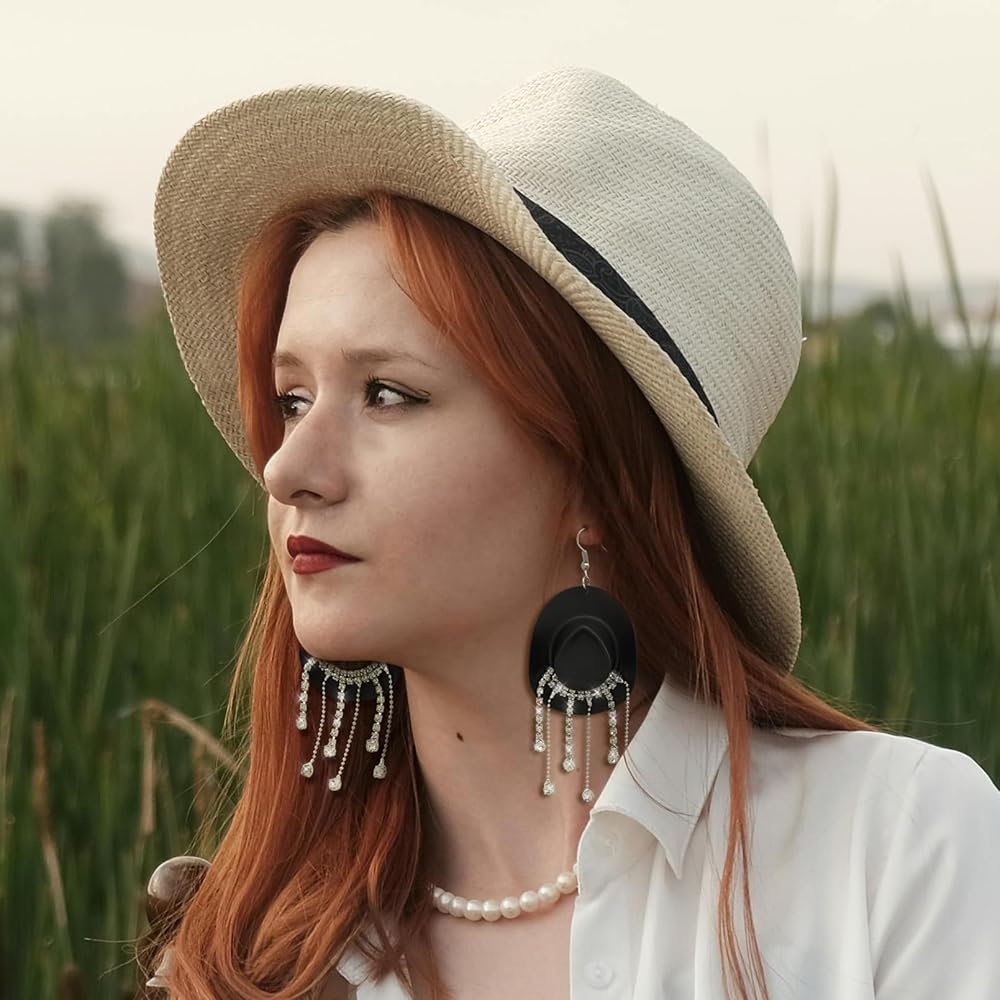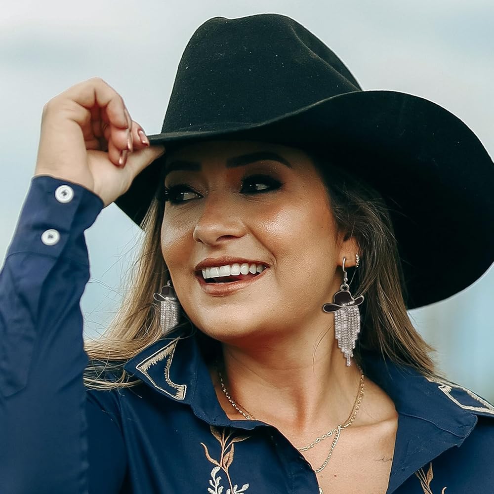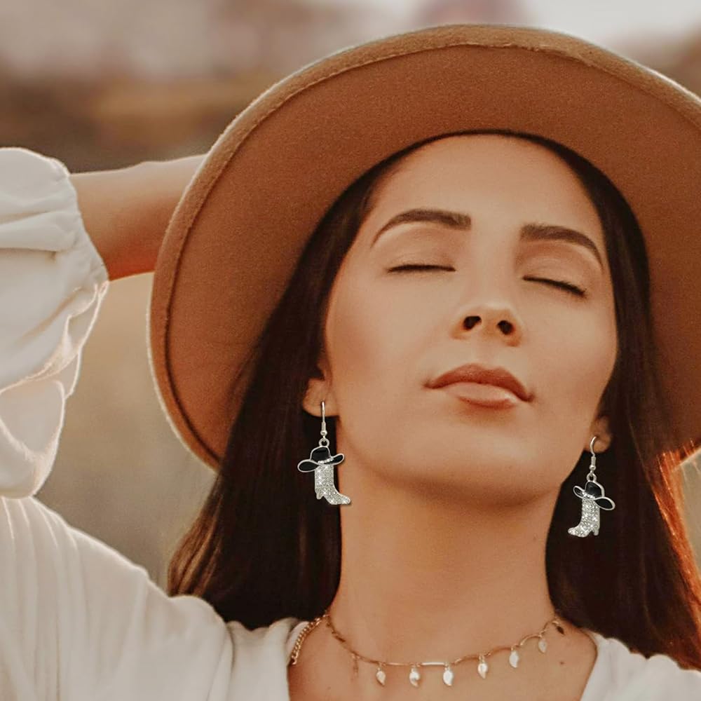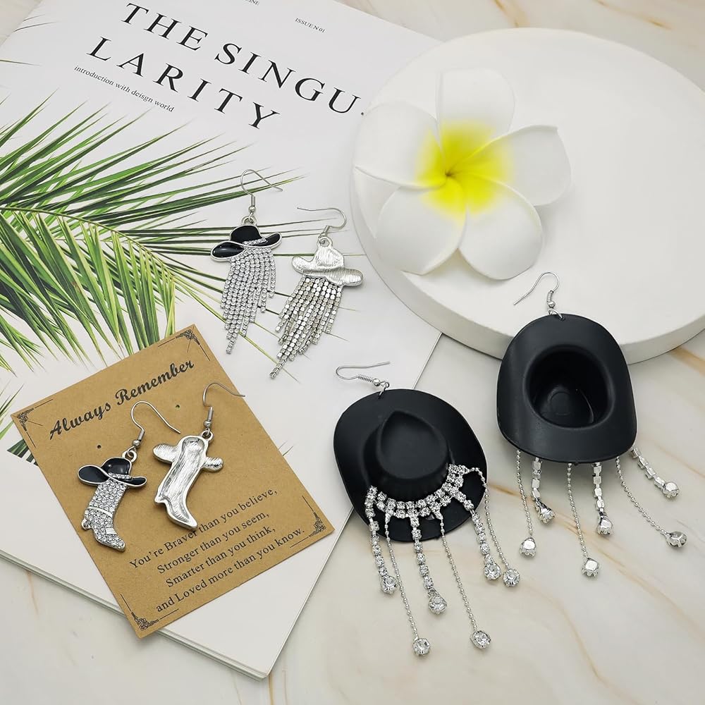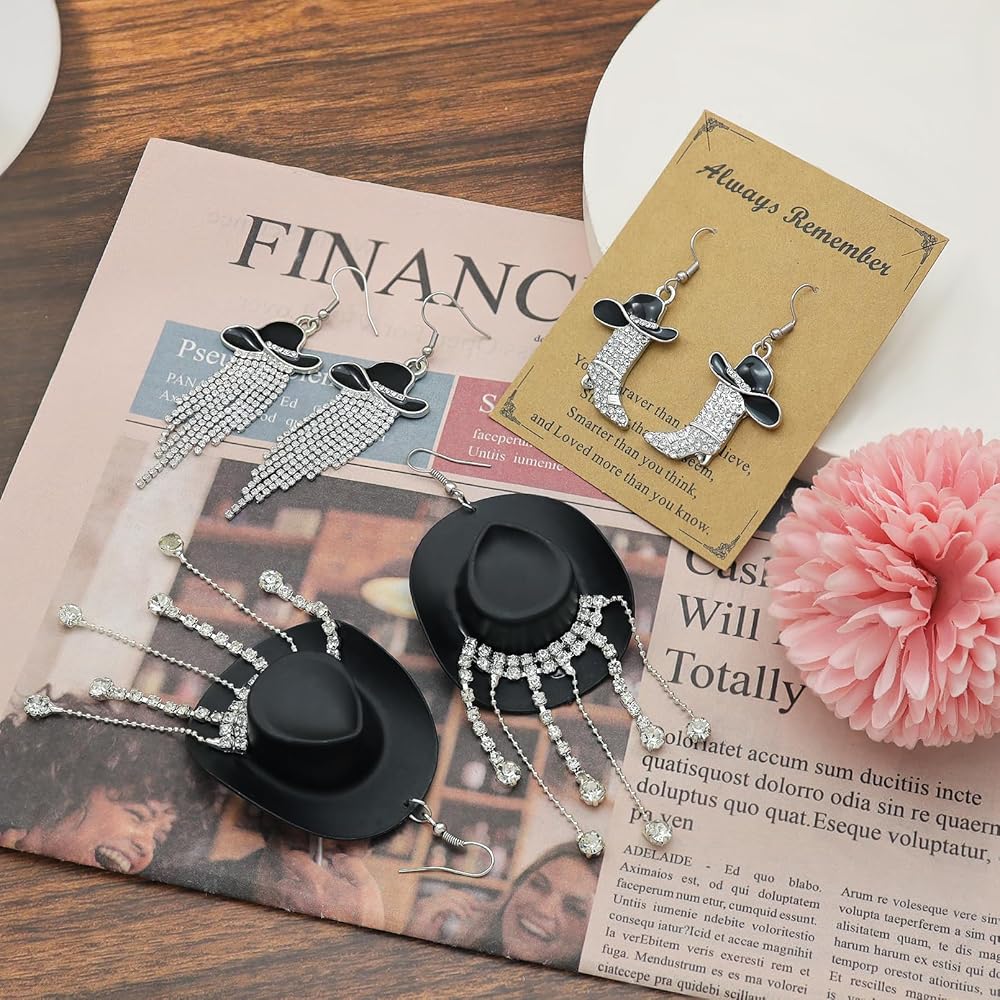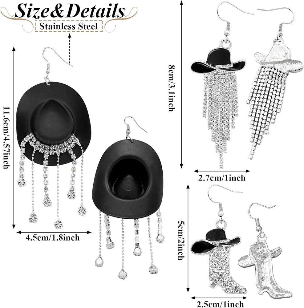 Western Earrings Set For Women: Country concert outfits accessories set for women.There are 3 pairs different styles earings, 1x Symmetric Hat Boots Earrings,1 X small Hat with rhinestone Tassels, 1x Big cowgirl hat with rhinestone tassels