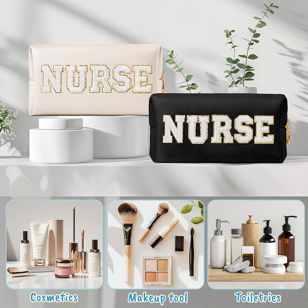 Elegant and Practical Design: This white makeup bag is adorned with gold PU leather accents and bold chenille patch letters spelling "NURSE." It's the perfect blend of style and function, making it an ideal gift for nurses during the holiday season.