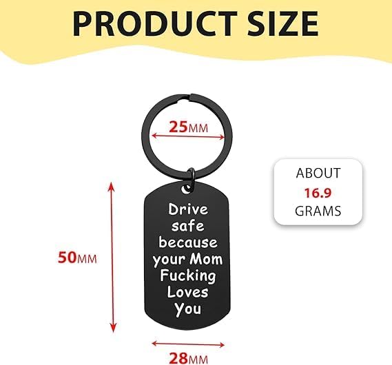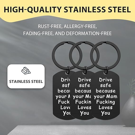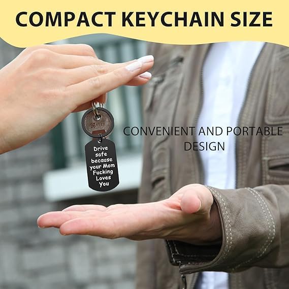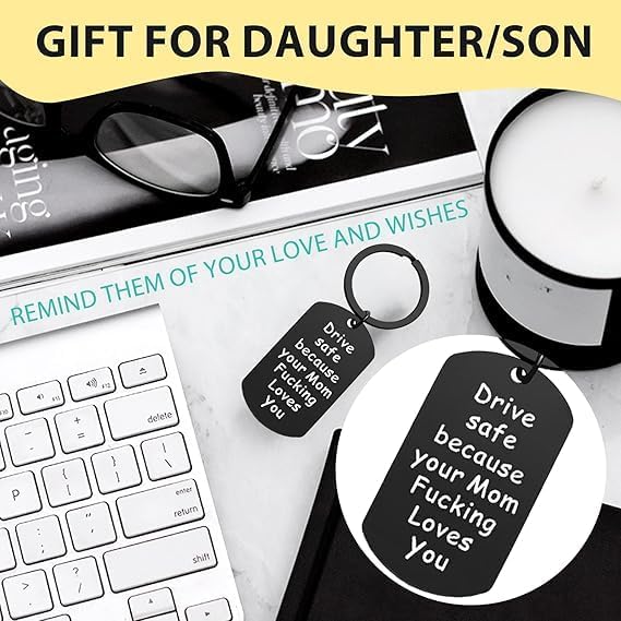 Drive Safe Keychain for Daughter/Son: This keychain features a humorous message that reads, "Drive safe because your Mom fucking loves you." It adds a touch of fun and humor to the keychain, making it a memorable and entertaining present . It's a great way to show your love and concern while bringing a smile to their face