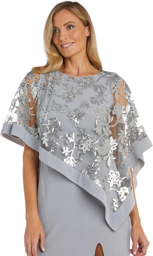 A matching poncho in sheer lace with sequin embellishments sits loosely over the shoulders, with an asymmetric handkerchief hem.