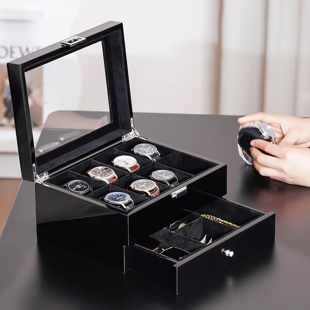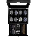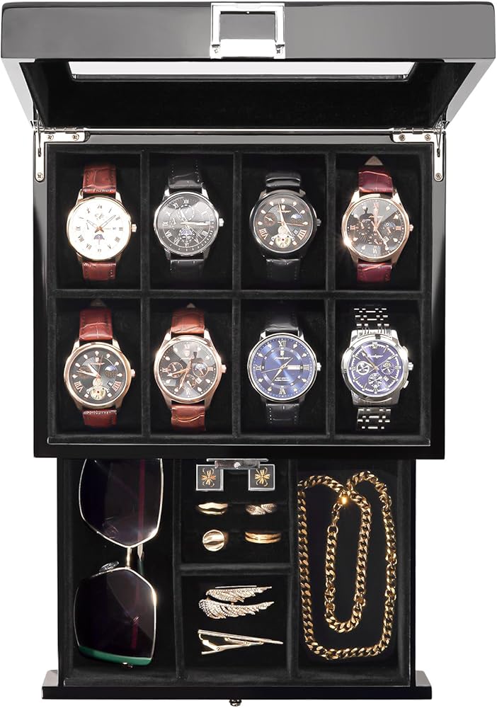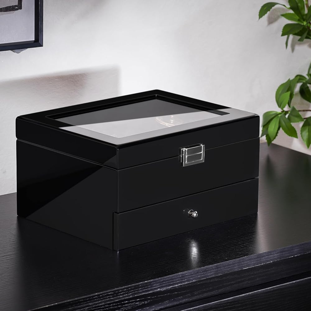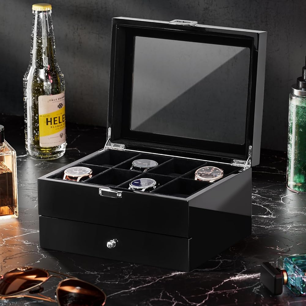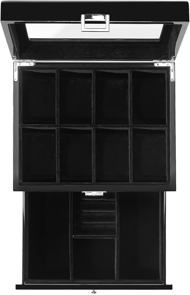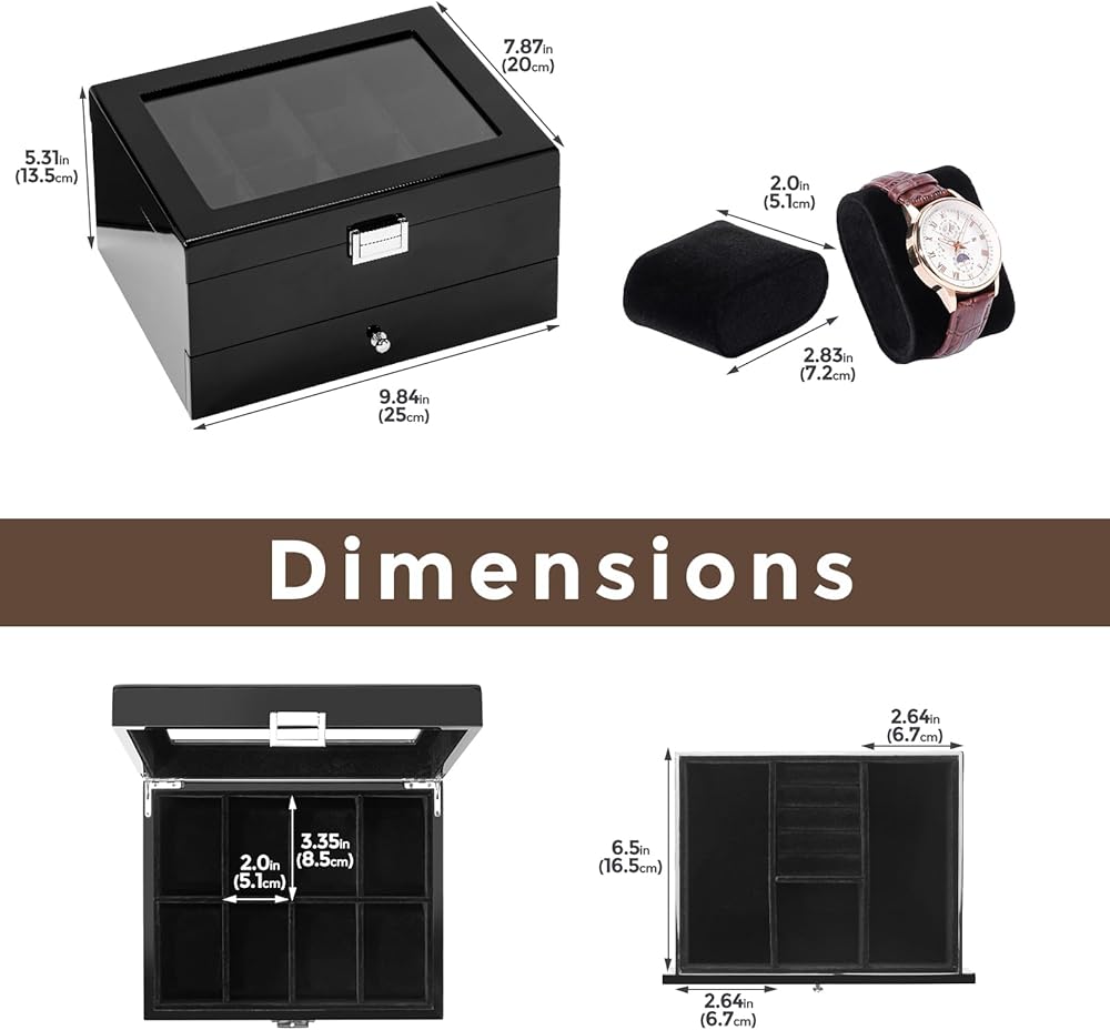 2-Layer: The upper layer can hold 8 watches, and the bottom drawer offers additional storage for watchbands, cufflinks, bracelets, rings, pens, necklaces, and other jewelry, keeping them in one place and protecting them against dampness, shaking and friction, or missing