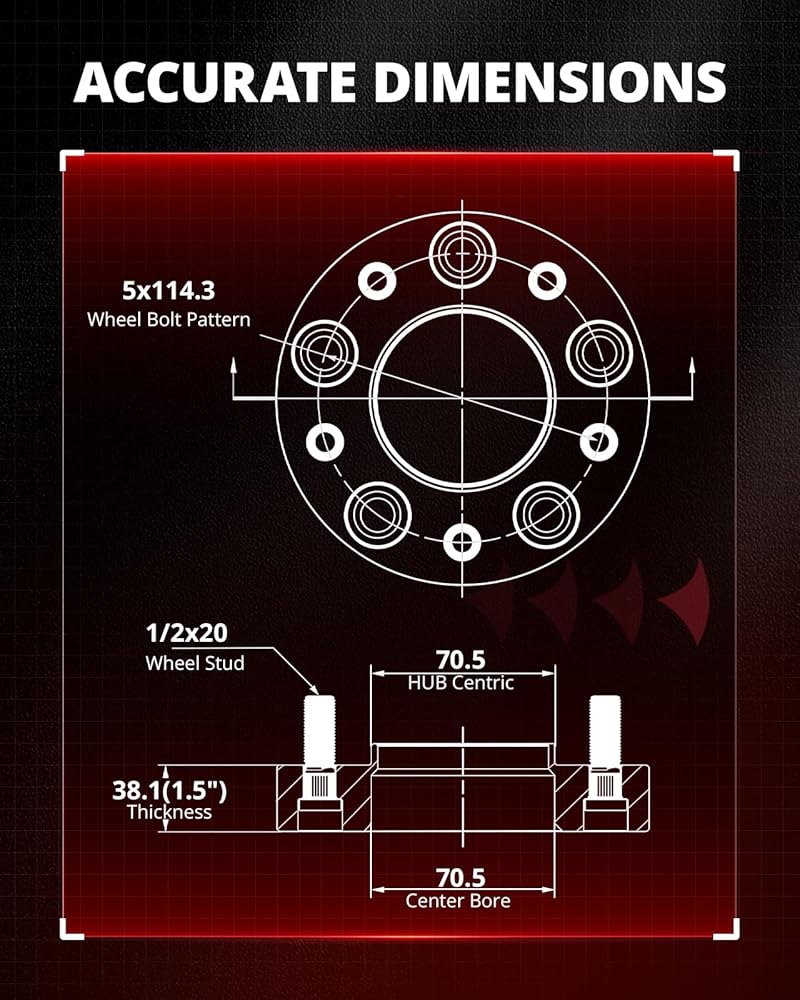 5x4.5 Wheel Spacers: 5x114.3 mm Hubcentric 5 lugs with Lip Bolts Pattern(PCD),Thickness:2 inch,Hub Centric:70.5 mm,Wheel Studs:1/2x20