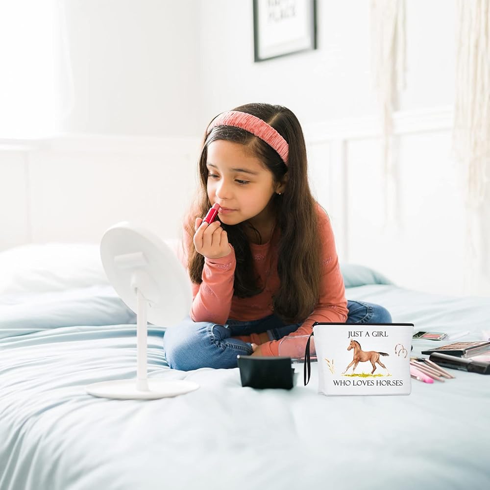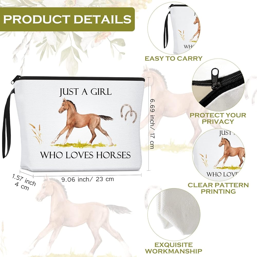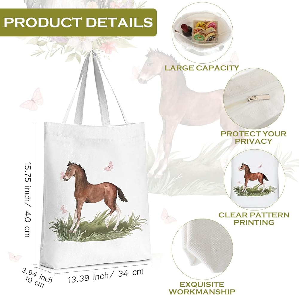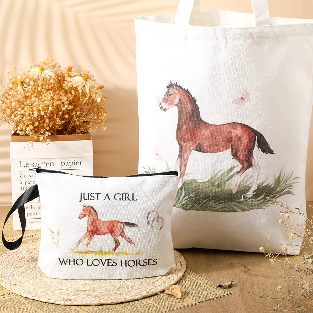 Features: Easy to carry: The suitable size and light weight of these bags are convenient for you to carry, no matter if you travel and go away on business. You could also put them in your suitcase, which will not take up too much space in your case without adding burden. Nice gifts: You can also share it as a thoughtful gift to your sisters, friends, classmates, and other people who love horses. They will be happy and surprised when they receive such practical gifts, showing your care and promoting your relationships. Specifications: Material: canvas Main color: whiteSize: Makeup zipper pouch: about 23 x 17 x 4 cm/ 9.1 x 6.7 x 1.6 inchesTote bag: about 34 x 40 x 10 cm/ 13.4 x 15.8 x 3.9 inchesPackage includes: 1 x Makeup zipper pouch1 x Tote bagNotes: Manual measurement, please allow slight errors on size. The color may exist a slight difference due to different screen displays.