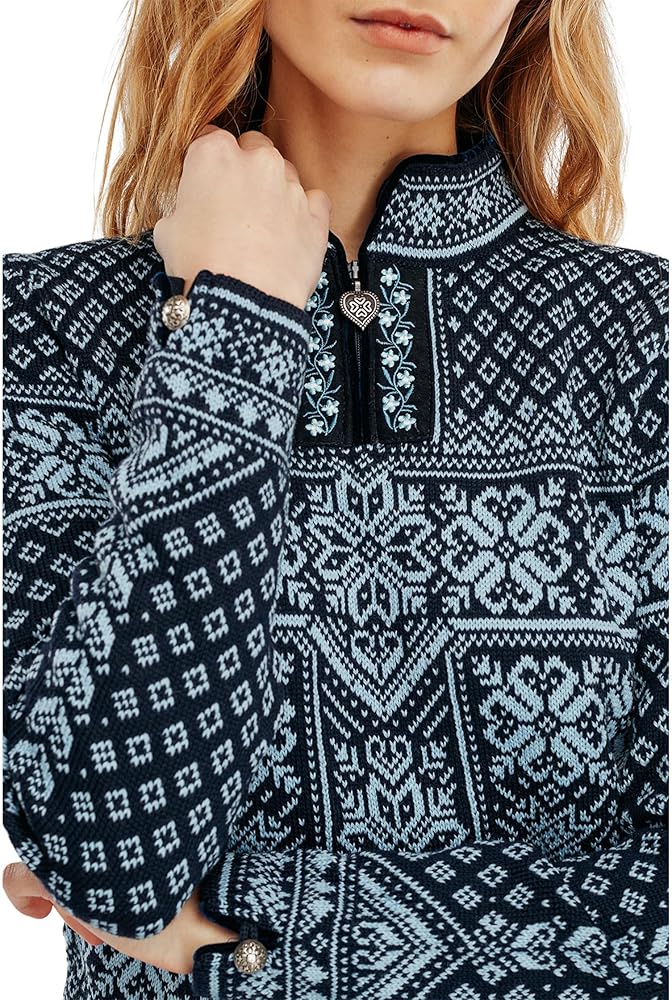 NORWEGIAN DESIGN: Women's pullover with turtleneck collar & Norwegian-made pewter buttons & heart quarter zip; Long sleeve with button snap cuff & straight hem cut; Med-high fleece neckline