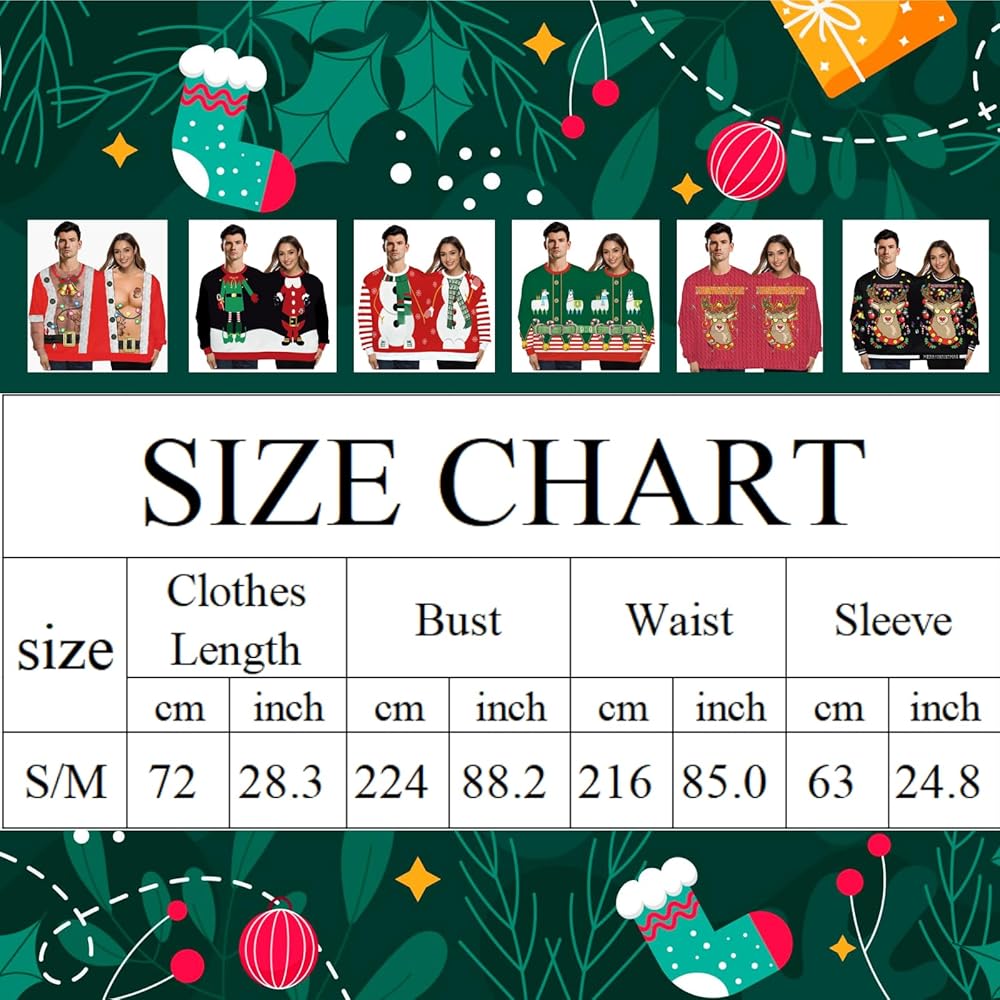 High Quality: Our funny ugly christmas sweater is a festive fashion style designed for couples or friends. It is made of high quality materials to ensure comfort and durability. The matching costumes for couples has a loose design and is suitable for both men and women