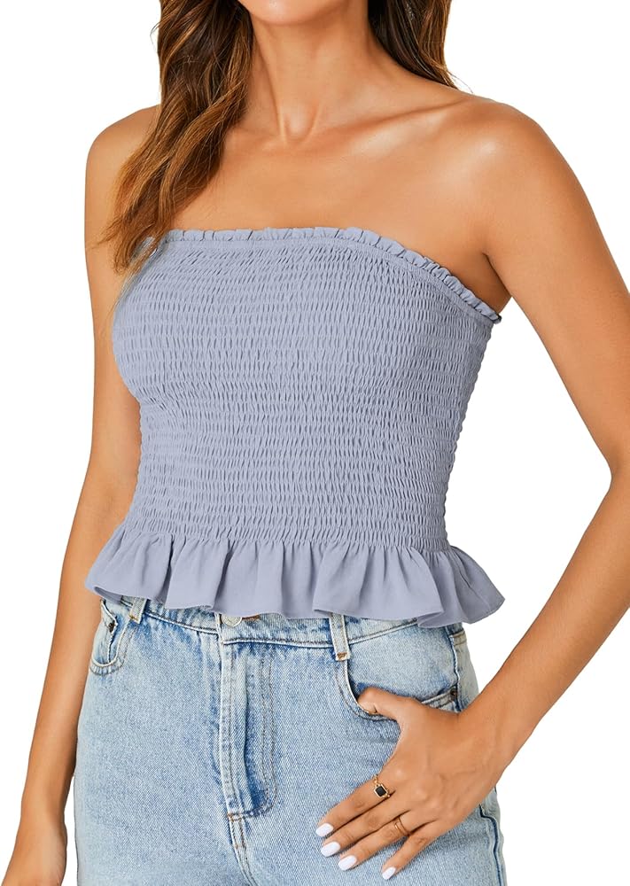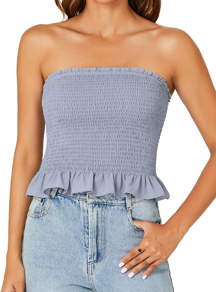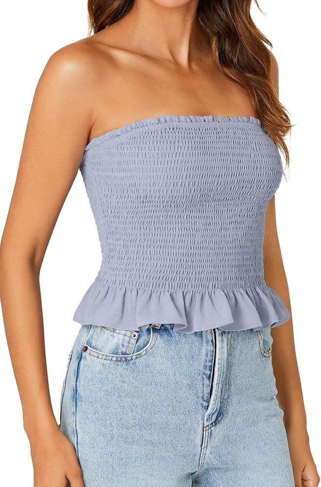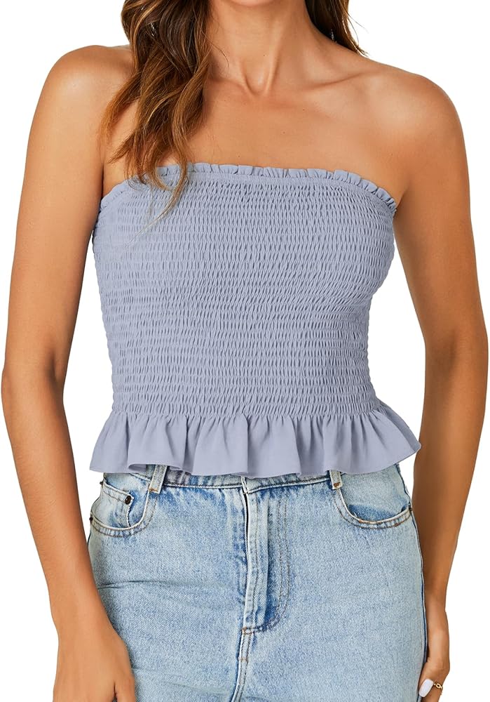 - This strapless tube top for women, with frill trim, shirred design, sleeveless peplum bandeau, elastic band at top but not at bottom lines.