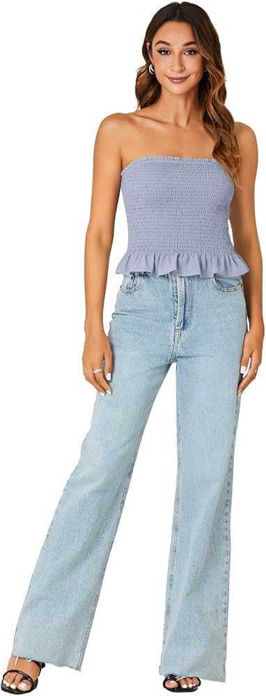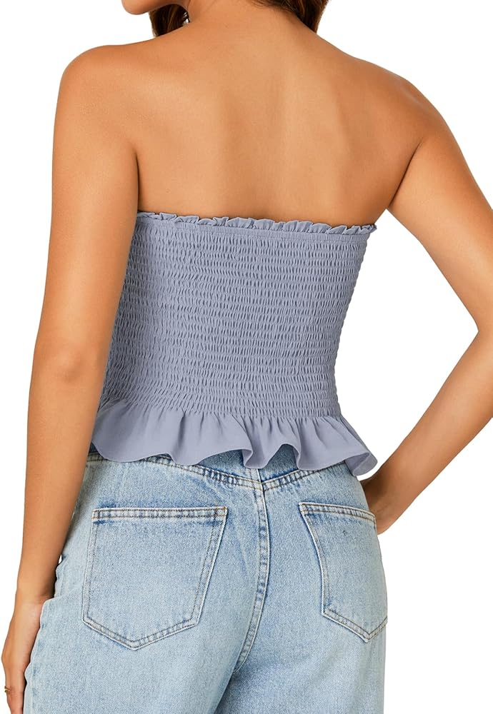 - Sleeveless tube top ruffle hem strapless blouse features with backless, solid color, off the shoulder, strapless shirts for women.
