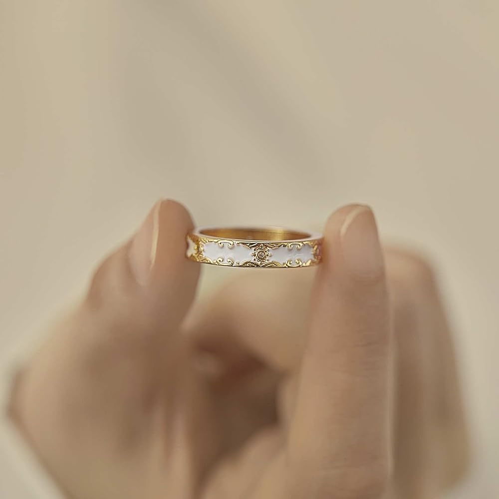 Mnyixsi Fashion Gold Enamel Stackable Open Ring, Handmade Carved Dainty Ethnic Style Colorful Lucky Band Ring Gift, Cute Enamel Engagement Cocktail Stacking Statement Ring for Couple White