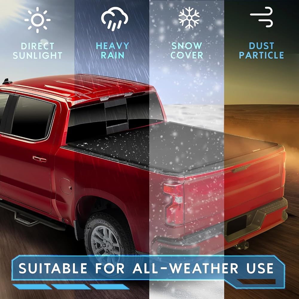 WATER-PROOF - Protect and secure the bed of your Chevy/GMC with this soft roll up truck bed tonneau cover. This truck bed cover features weather sealing on all sides and corners, and a fast fold design that stores at the front of the bed when hauling large items.