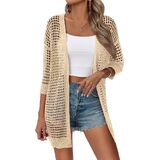 Design: Kimono cardigans for women, short sleeve, hollow out, loose fit, open front, crochet knit, ribbed cuffs and hem, solid color, below hip length, casual and boho style