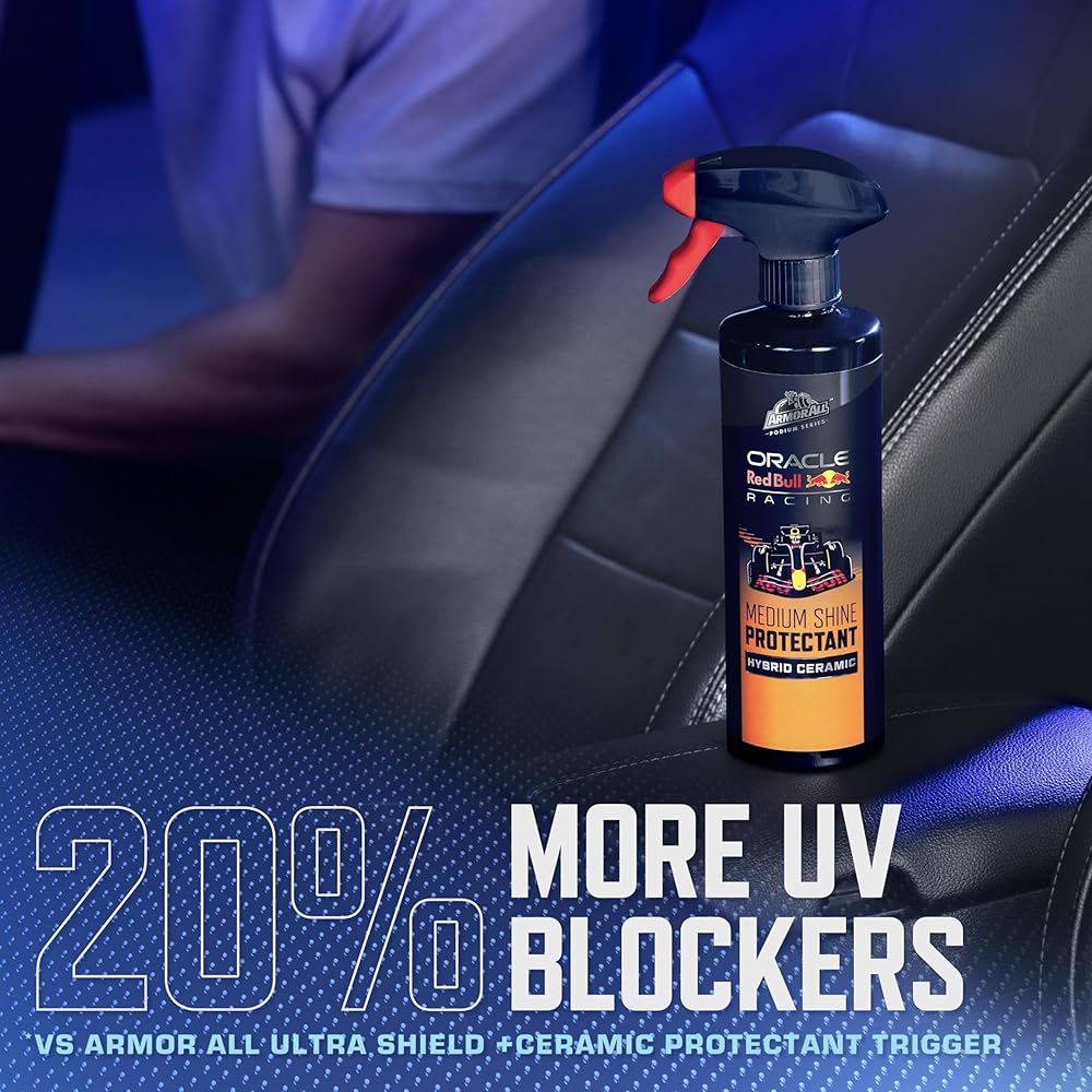 Developed in collaboration with Oracle Red Bull Racing, the Armor All Podium Series Hybrid Ceramic Medium Shine Protectant Wipes provide quick, easy cleaning and exceptional UV protection for interior vinyl, rubber, and plastic (VRP) surfaces. These oversized car wipes are 20% larger* and specially designed to maximize the cleaning and protection in each wipe. The convenient pre-moistened car interior protectant wipes feature 20% more UV blockers* to prevent UV damage, with a formula that nourishes, shines, and improves color depth. This hybrid ceramic formula leaves behind a long-lasting SiO2-based protective barrier that helps repel future stains and dust build up. Ideal for full detailing or a quick wipe on the go, these high-performance car cleaner and protectant wipes are the simplest yet best way to maintain your vehicle's VRP. The difference is hybrid ceramic technology, which combines SiO2-based protection with synthetic elements that optimize performance, versatility and ease across cleaning and detailing tasks. This approach provides long-lasting surface protection and podium-worthy results, whether driving to the track or on your daily commute. (*vs Armor All Ultra Shield +Ceramic Protectant Wipes)