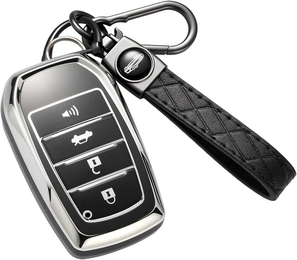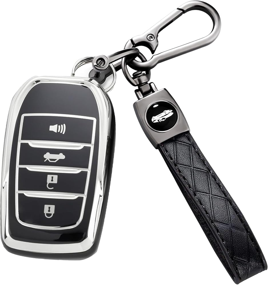 【Premium Material】: The key fob case is made with Premium Soft TPU,comfortable and soft, excellent touch feeling, looks good. Super thin, fits like a glove. Besides, the genuine leather lanyard and shiny zinc alloy car keys keychain could prevent from losing while you take along.