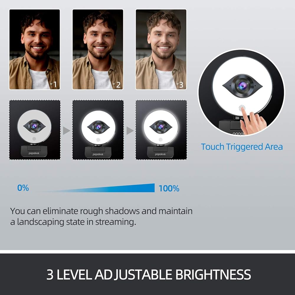 【Adjustable Ring Light wiht Three-level Modes】The 1080P webcam has three-level light adjustment function, and the light can be switched by gently touching the bottom of the web cam. When you use the computer webcam in video conference, webcast and other scenes, you can fill in the light immediately to keep a clear video state.