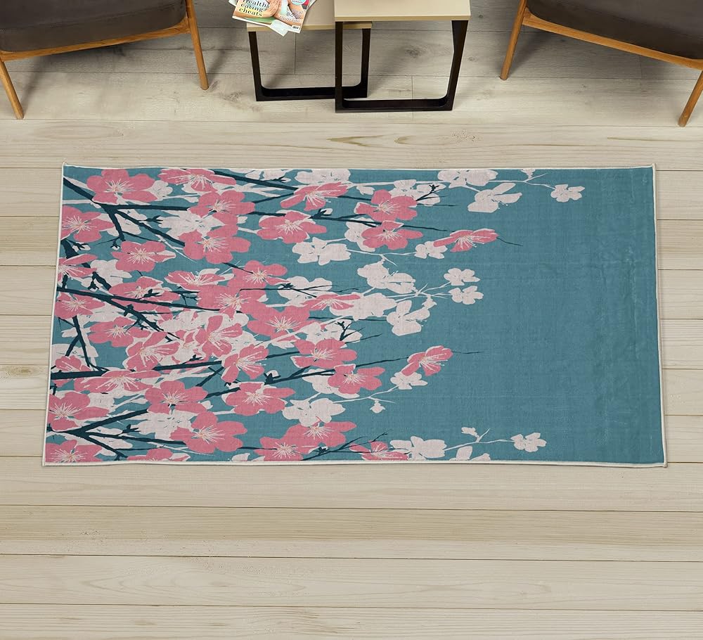Lunarable East Decorative Rug, Japanese Cherry Blossoms Sakura Branches Spring Flower Garden Illustration, Quality Carpet for Bedroom Dorm and Living Room, 2' X 5', Dark Turquoise